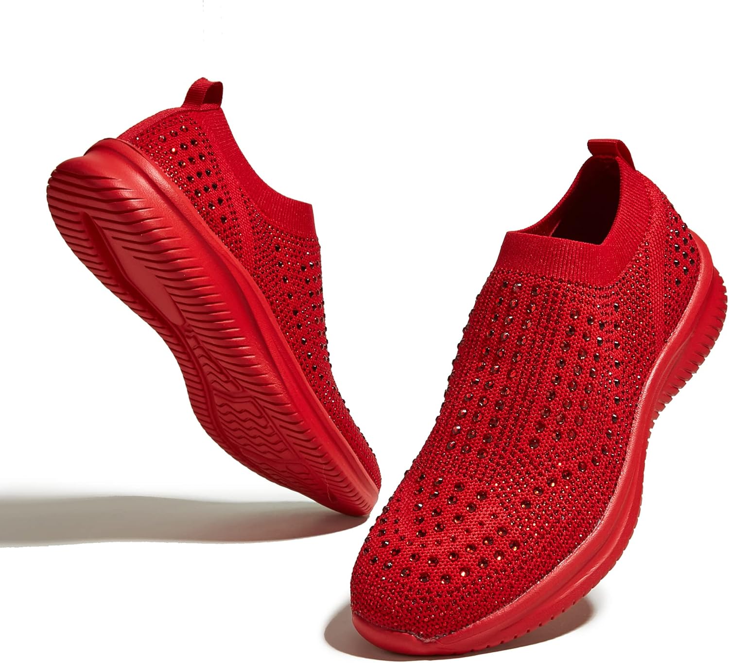 BELOS Women’s Rhinestone Mesh Slip On Walking Shoes Fashion Breathable Spakle Glitter Sneaker