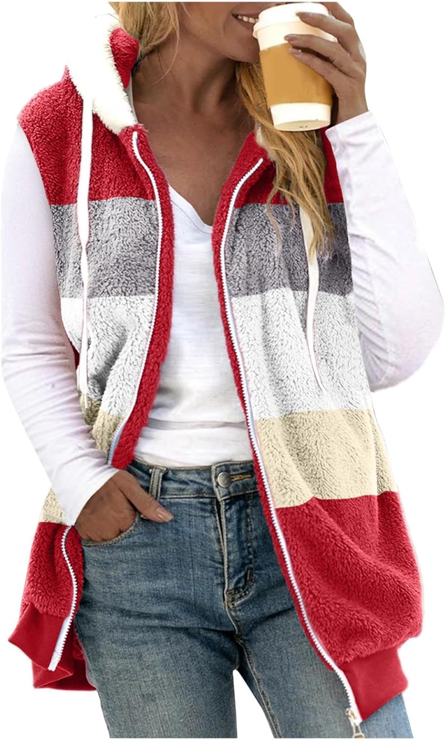 Oversized Sherpa Vest Womens Fuzzy Warm Hooded Vest Long Color Block Sleeveless Reversible Zip Up Jacket with Pockets