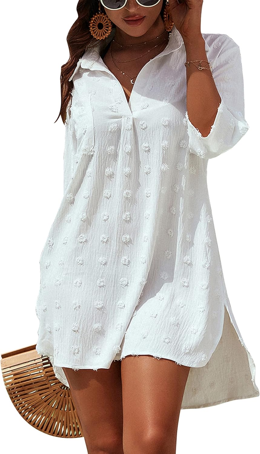 Ekouaer Bathing Suit Cover Up for Women V Neck Button Down Swimsuit Coverup Beach Dress Shirt S-3XL