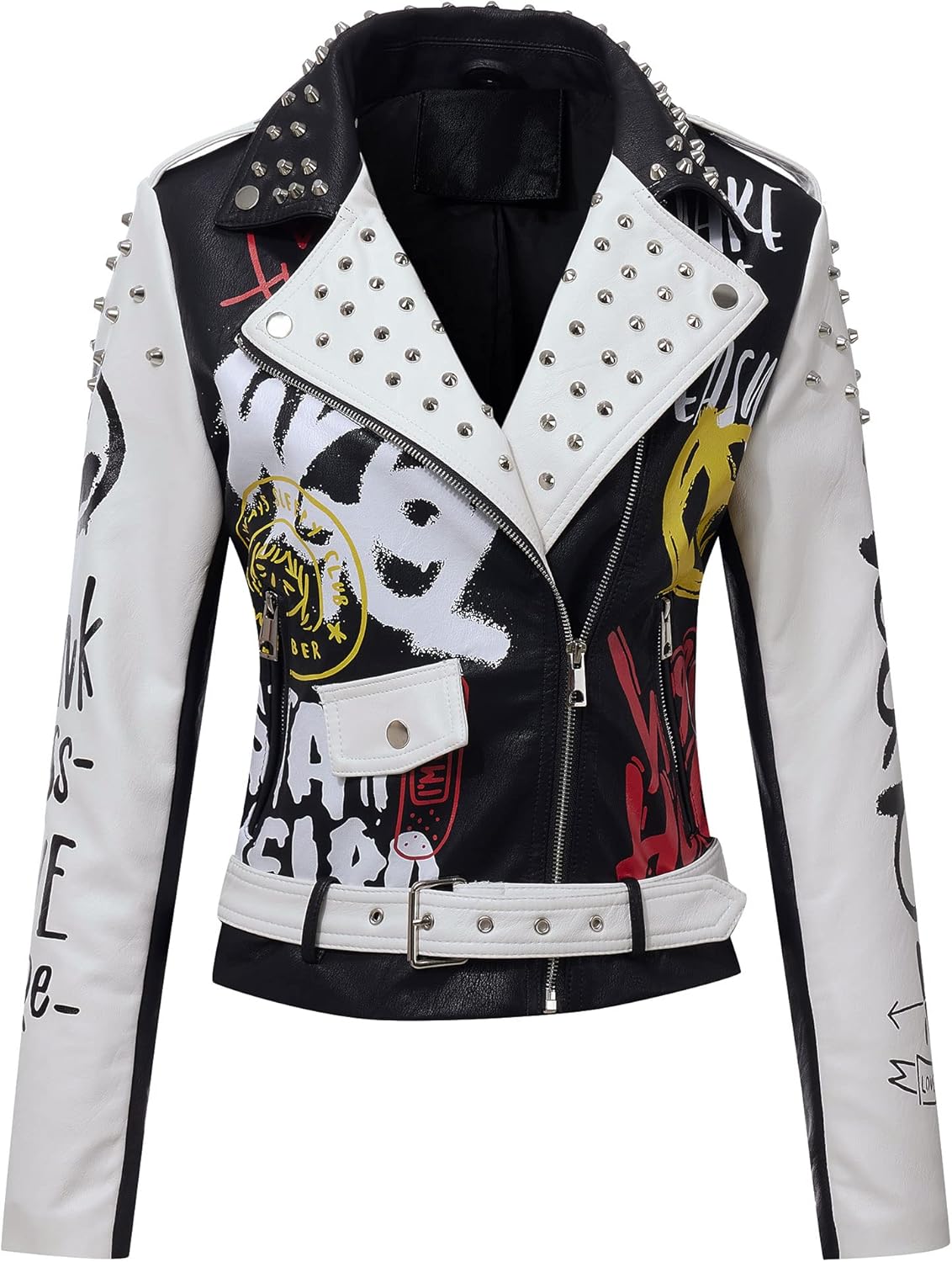 RISISSIDA Women Faux Leather Jacket Studded Rivet Spring Fall Fashion, Hip-Length Moto Biker Trendy Clothes Streetwear Belted