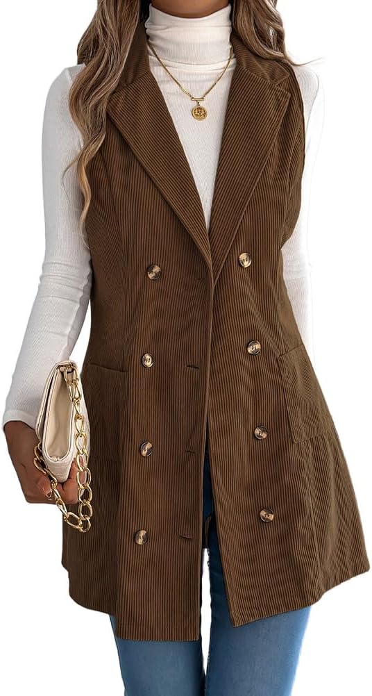 Mywinway Corduroy Vest Women Fall Winter Sleeveless Double Breasted Long Blazer Jackets Coats Waistcoat Outwear
