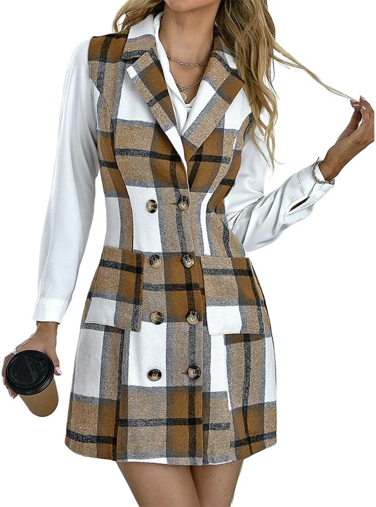 GORGLITTER Women’s Plaid Checkered Long Vest Button Down Double Breasted Sleeveless Jacket Fall Fashion