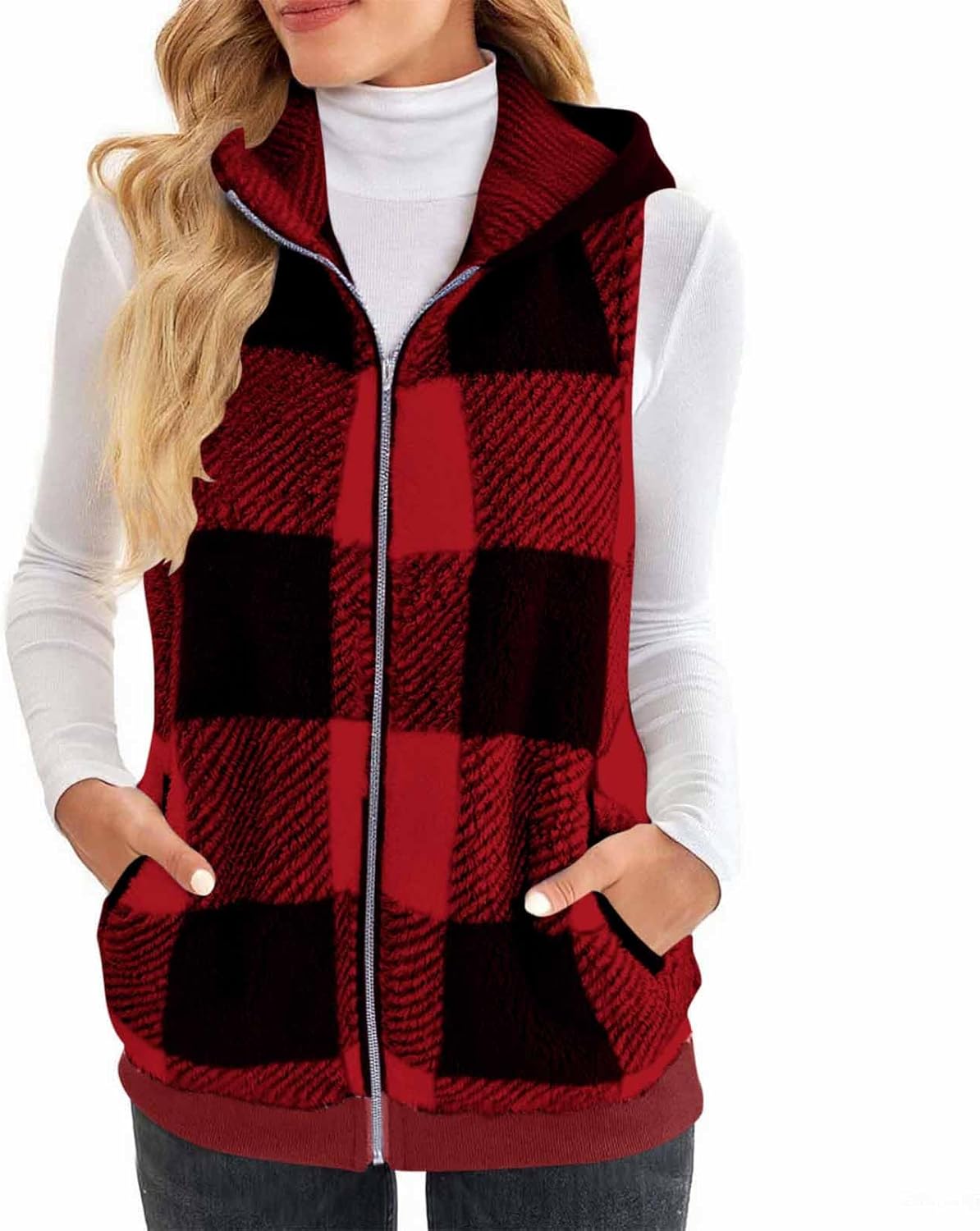 Womens Sleeveless Plaid Fleece Jacket Zip up Fuzzy Sherpa Vest Hooded Coats Casual Warm Vests Outerwear with Pockets