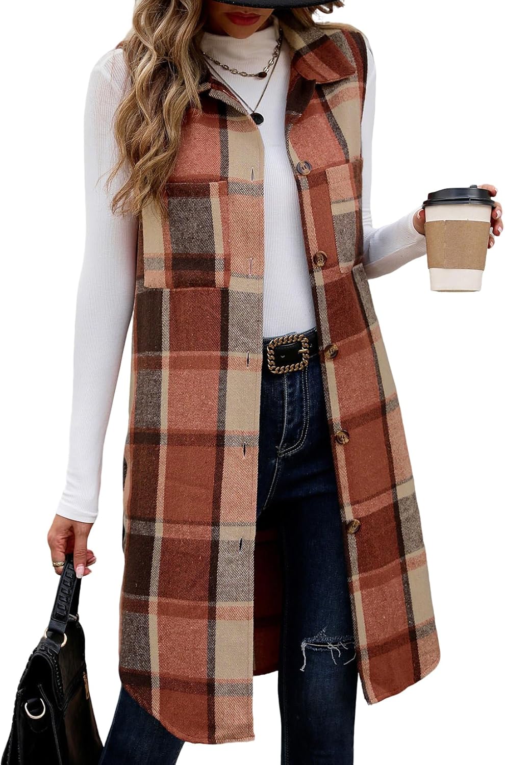 IDEALSANXUN Womens Long Plaid Vest Fall Winter Casual Long Sleeveless Vest Jacket