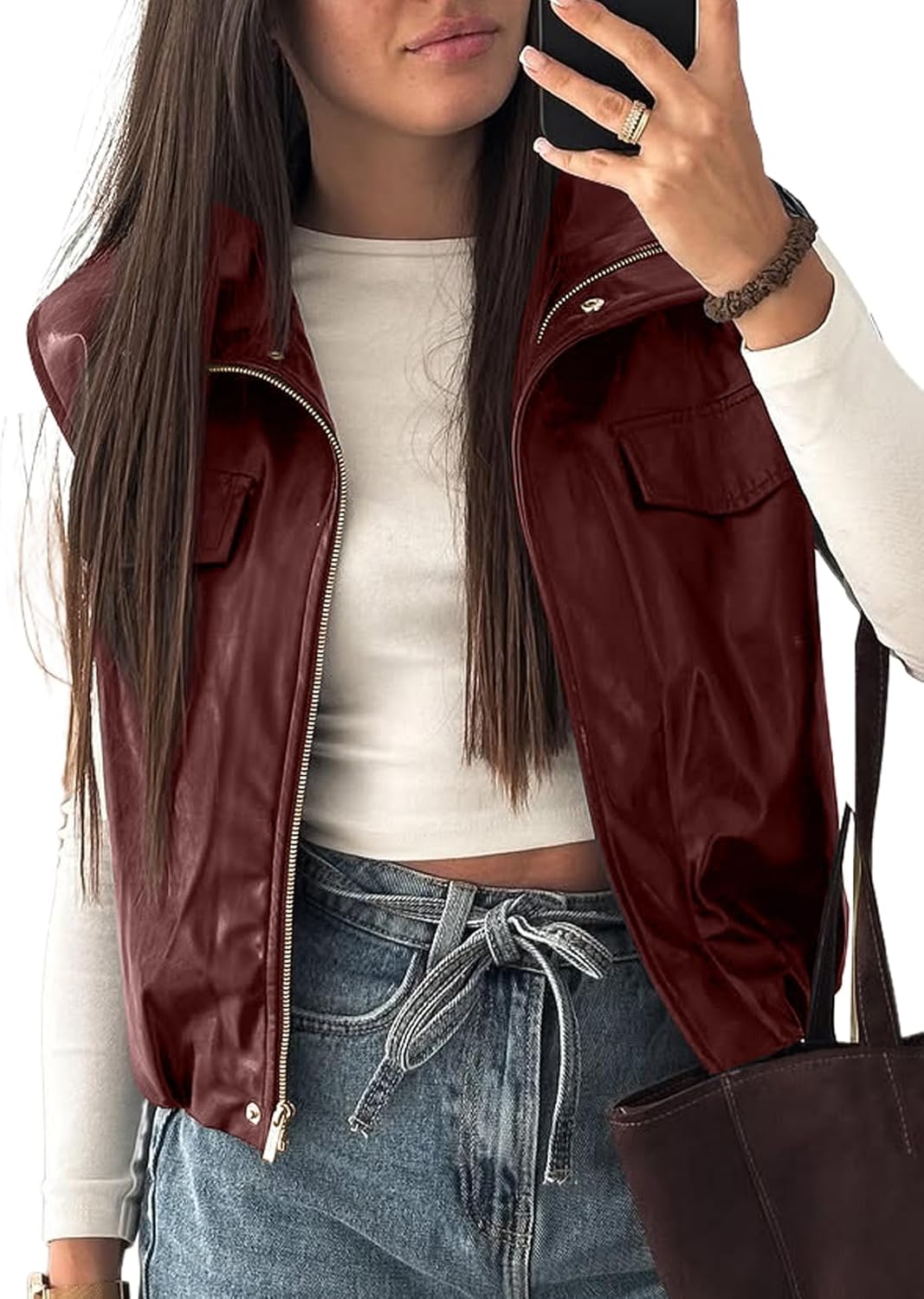 Faux Leather Vest For Women Zipper Cropped Sleeveless Biker Moto Slim PU Motorcycle Waistcoat