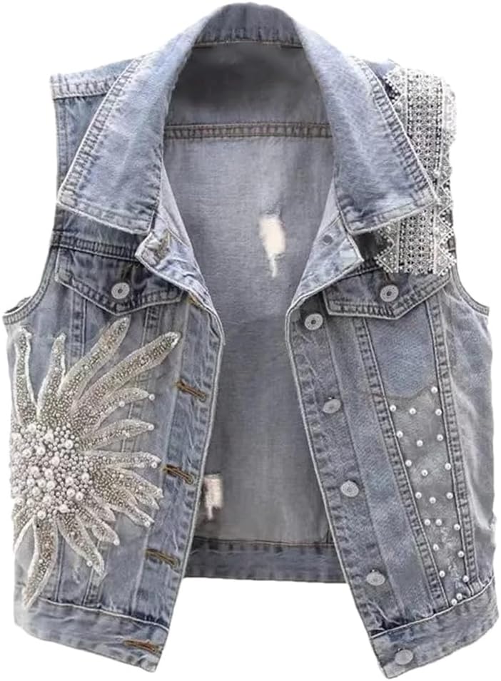 MISS MOLY Women’s Cropped Distressed Ripped Denim Vest Classic Sleeveless Jean Vest Jackets With Flap Pockets