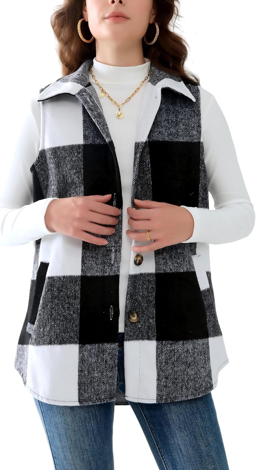 Mmoneyake Plaid Vest for Women Fall Button Down Shirt Jacket Sleeveless Shacket Lightweight Lapel Neck Coat Casual Outwear