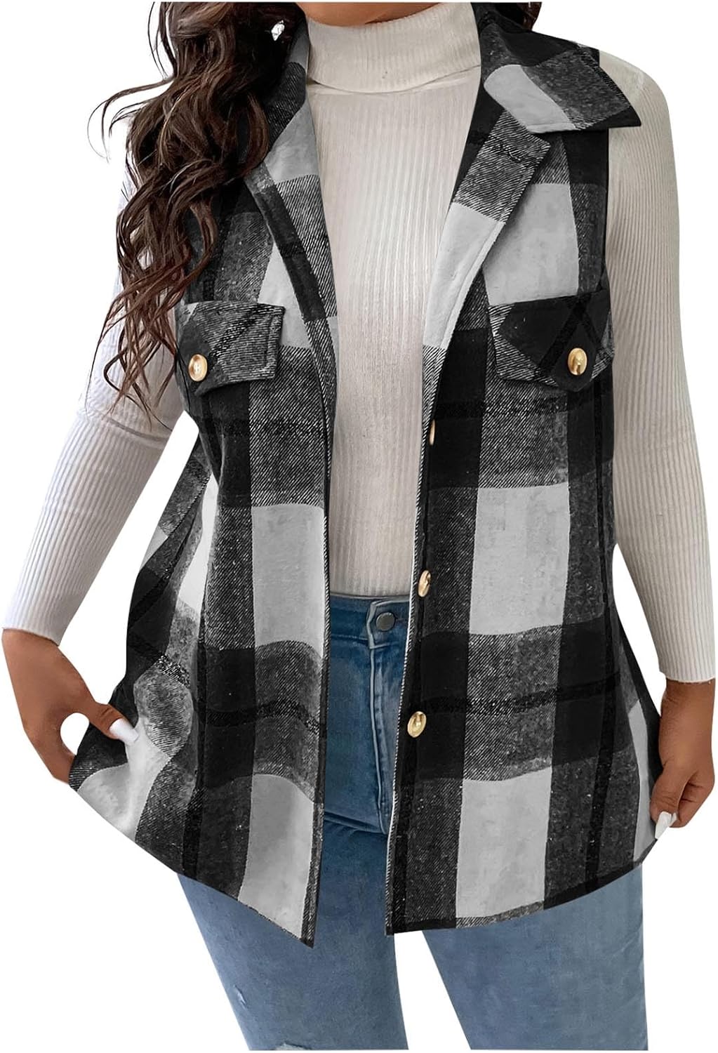 Mansy Womens Fall Flannel Plaid Outerwear Vest Casual Lapels Button Down Shirt Fashion Sleeveless Jacket Cardigan Coat