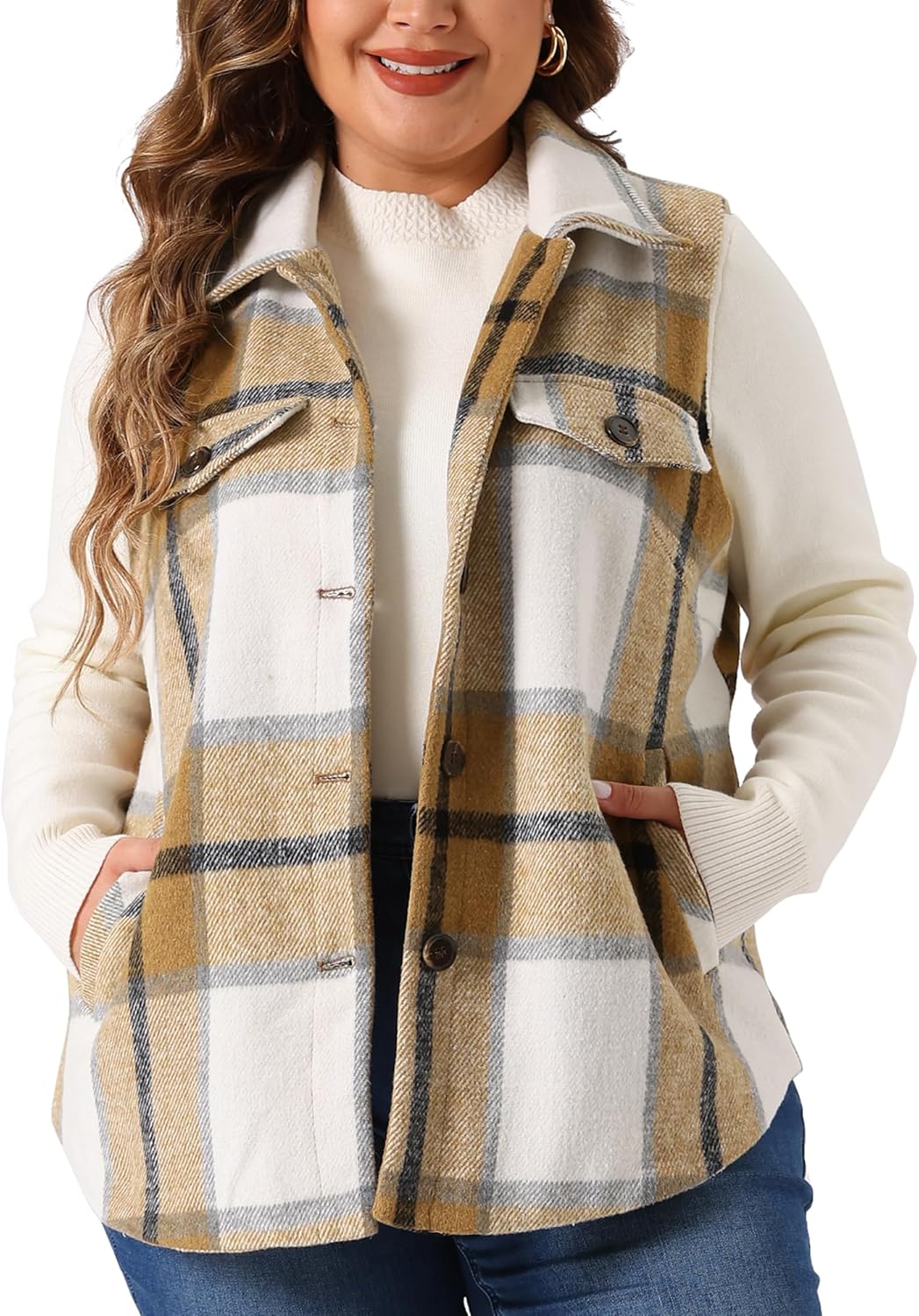 Agnes Orinda Plus Size Coat for Women Plaid Vest Coat Slash Pocket Sleeveless Button Down Jacket Outerwear