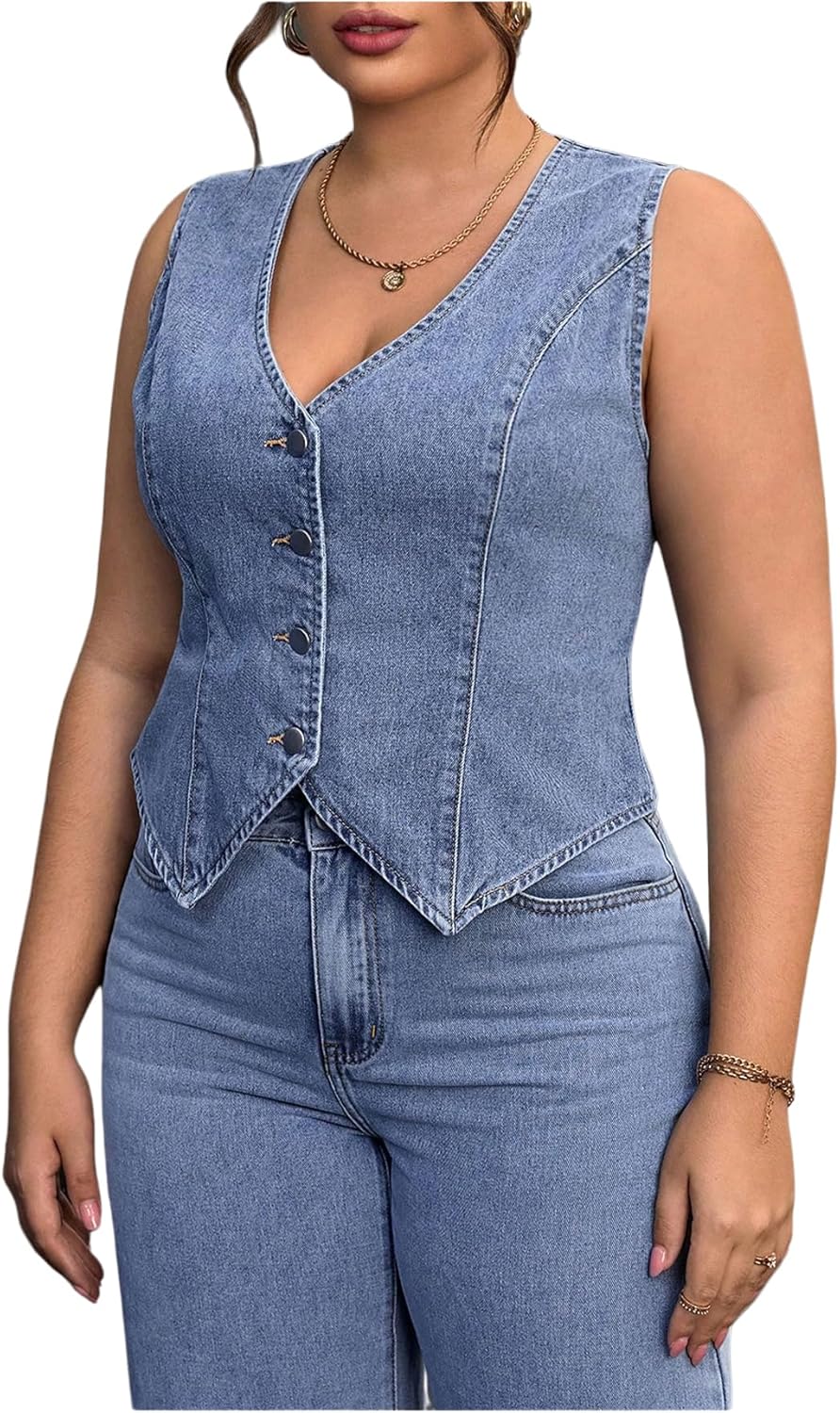 WDIRARA Women’s Plus Size V Neck Vest Denim Jacket Button Down Sleeveless Jean Waistcoat