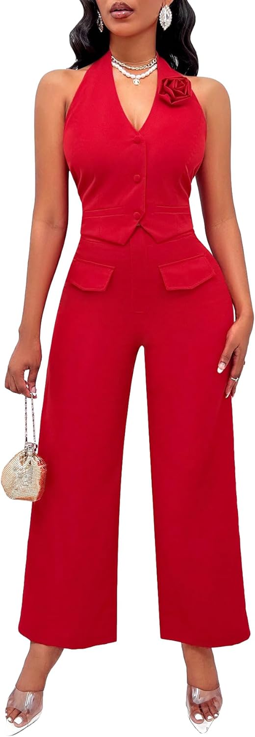 WDIRARA Women’s Rose Appliques Button Front Halter Neck Sleeveless Waistcoat V Neck Backless Vest Blazer Jacket