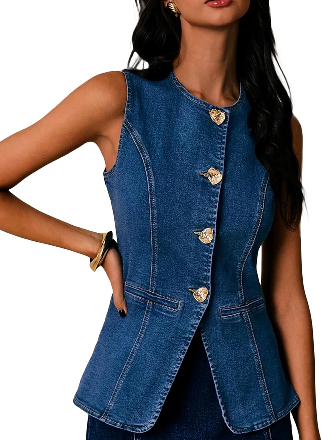 Mina Self 2025 Womens Summer Denim Vest Tops Sleeveless Lightweight Button Down Crewneck Casual Western Fashion Jean Jacket