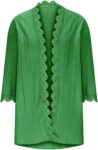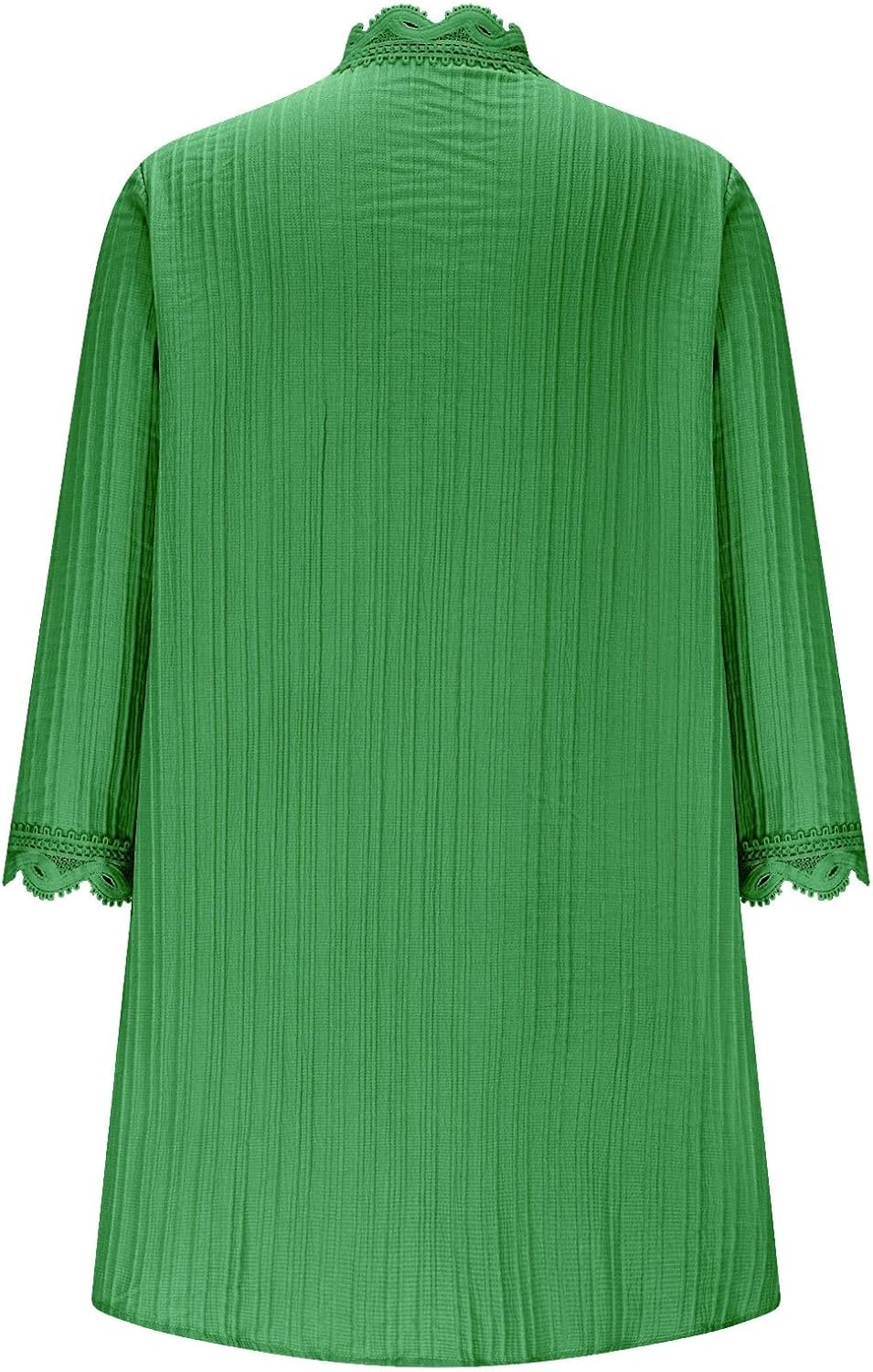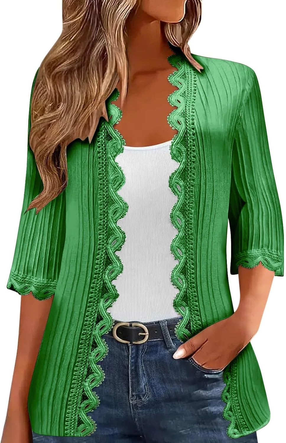 3/4 Length Sleeve Cardigan for Women Fall Lightweight Casual Open Front Crochet Lace Scalloped Trim Pleated Cardigans