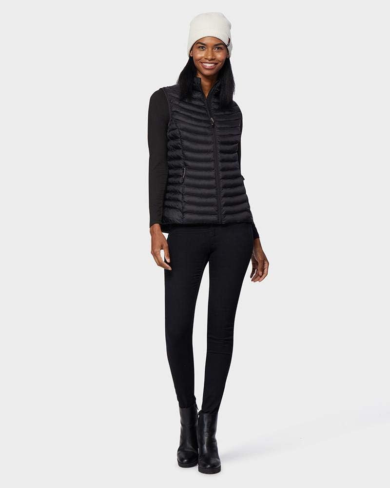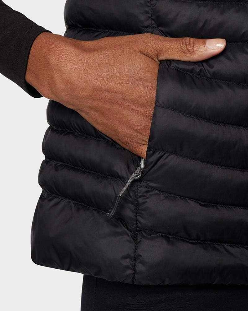 32 Degrees women’s recycled poly-fill lightweight vest. A sustainable, packable vest made of a lightweight woven with a soft, smooth texture and a 100% synthetic down recycled polyster with 600 fill power.