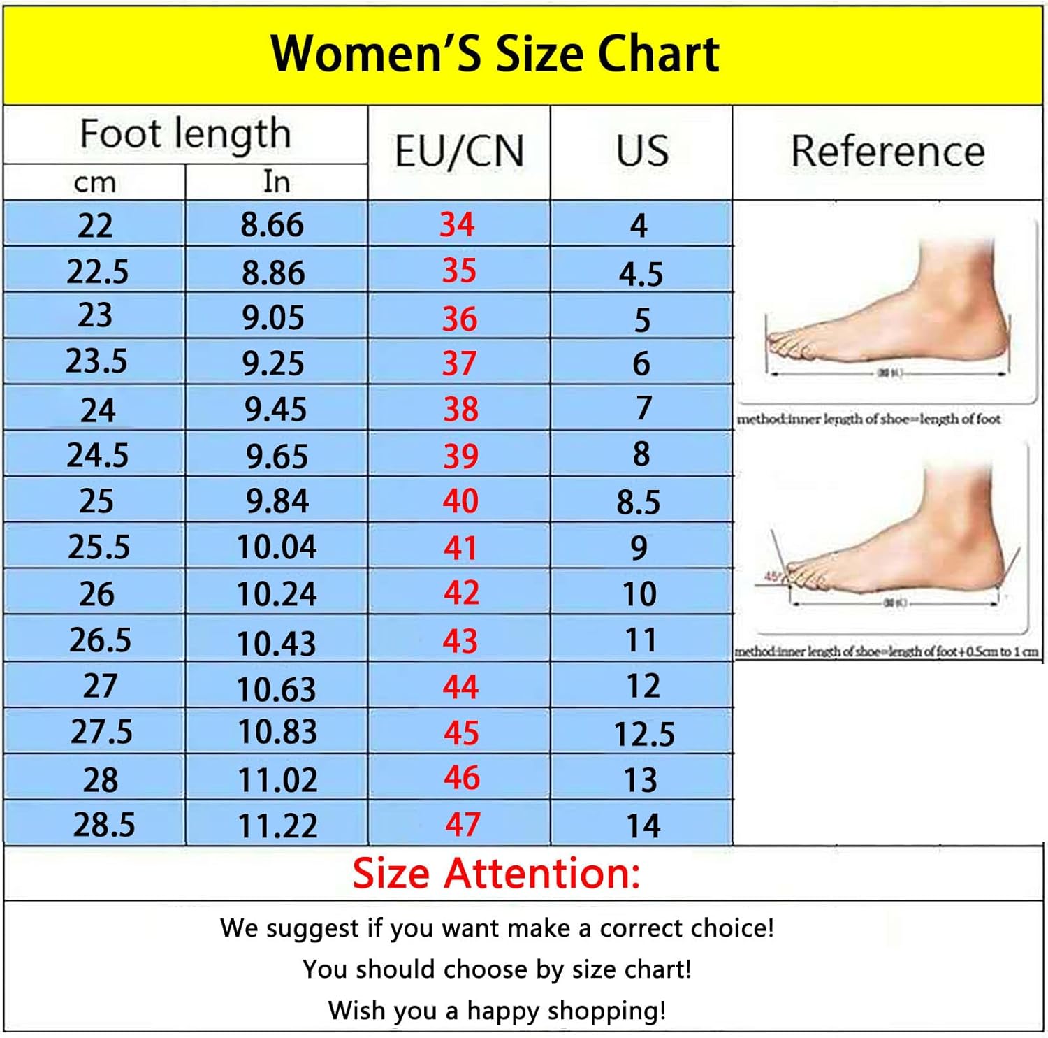 1. Please measure your foot length and width carefully before ordering, then choose the correct size according to our size chart!