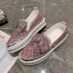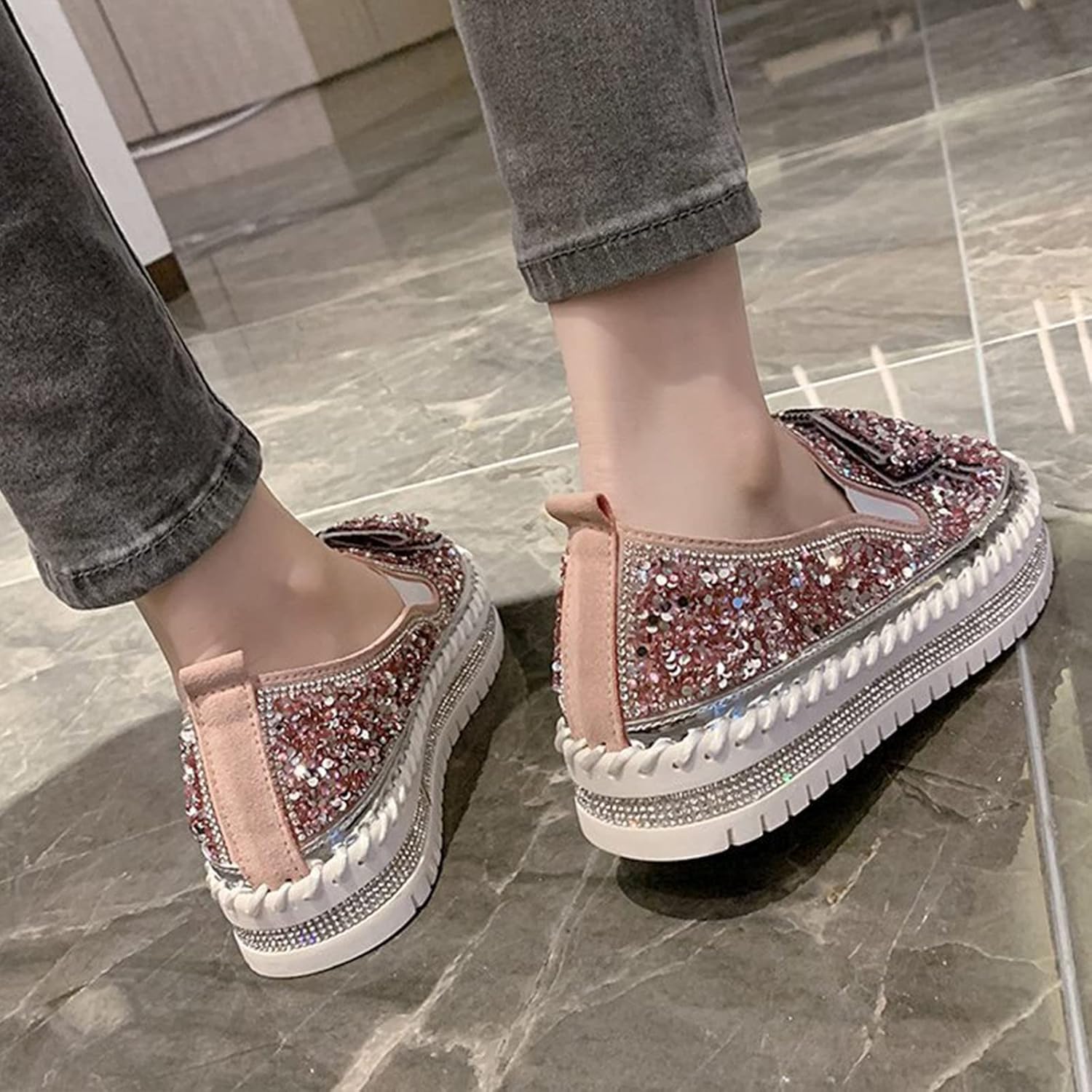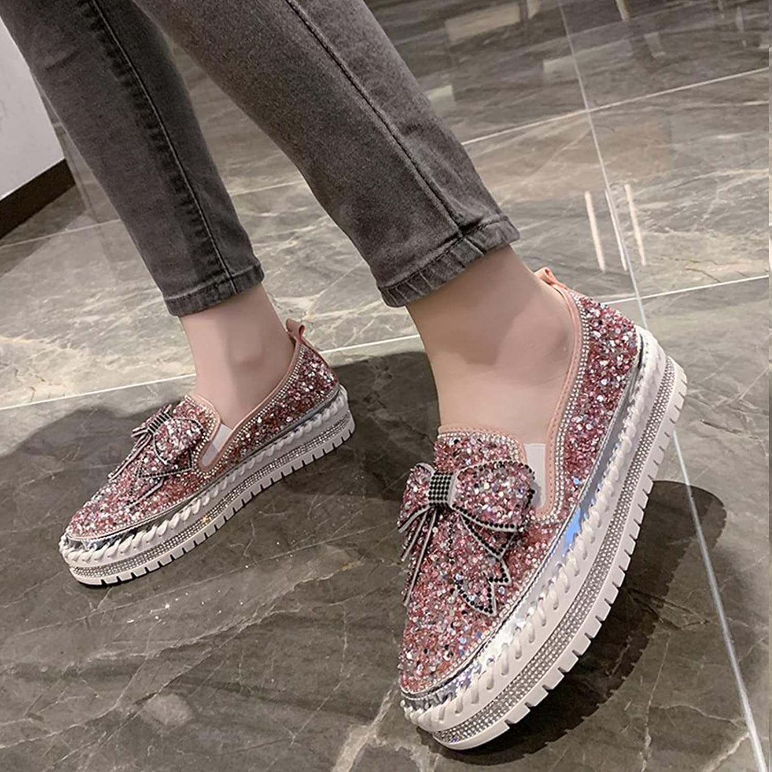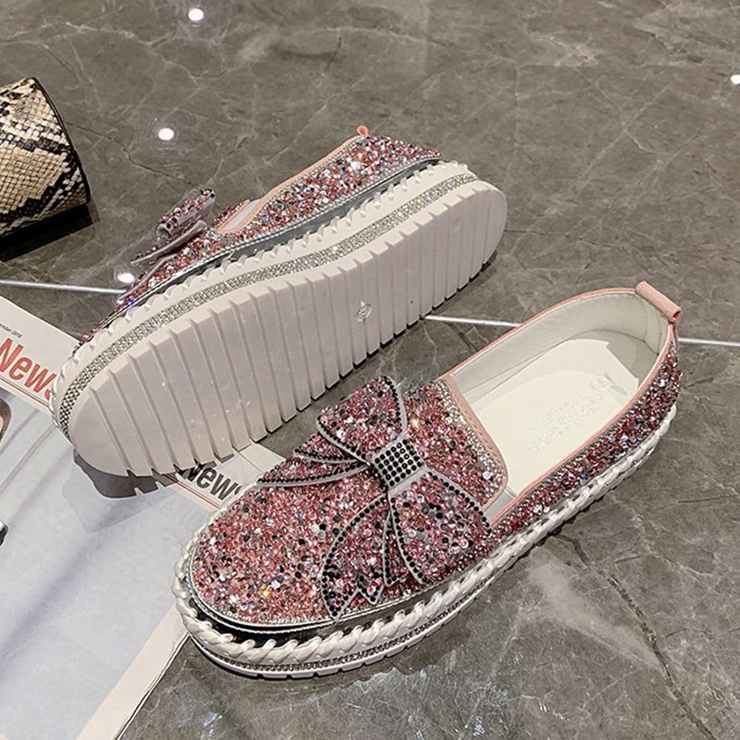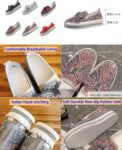 AngryMonkey Women’s Rhinestones Glitter Slip On Sneakers,Cute Bow Comfort Platform Walking Flat Loafer Stitch Casual Shoes