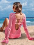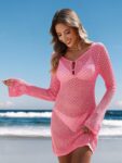 BB&KK Womens Crochet Swimsuit Cover Up Long Bell Sleeve Knot Back Dress Summer Mesh Knit Bathing Suit Beach Vacation Outfits