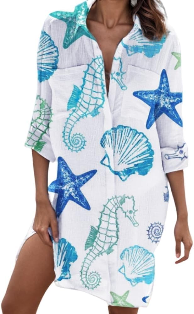 Beach Cover Ups for Women Summer Button Down Midi Shirt Dresses Vacation Swimwear Coverup