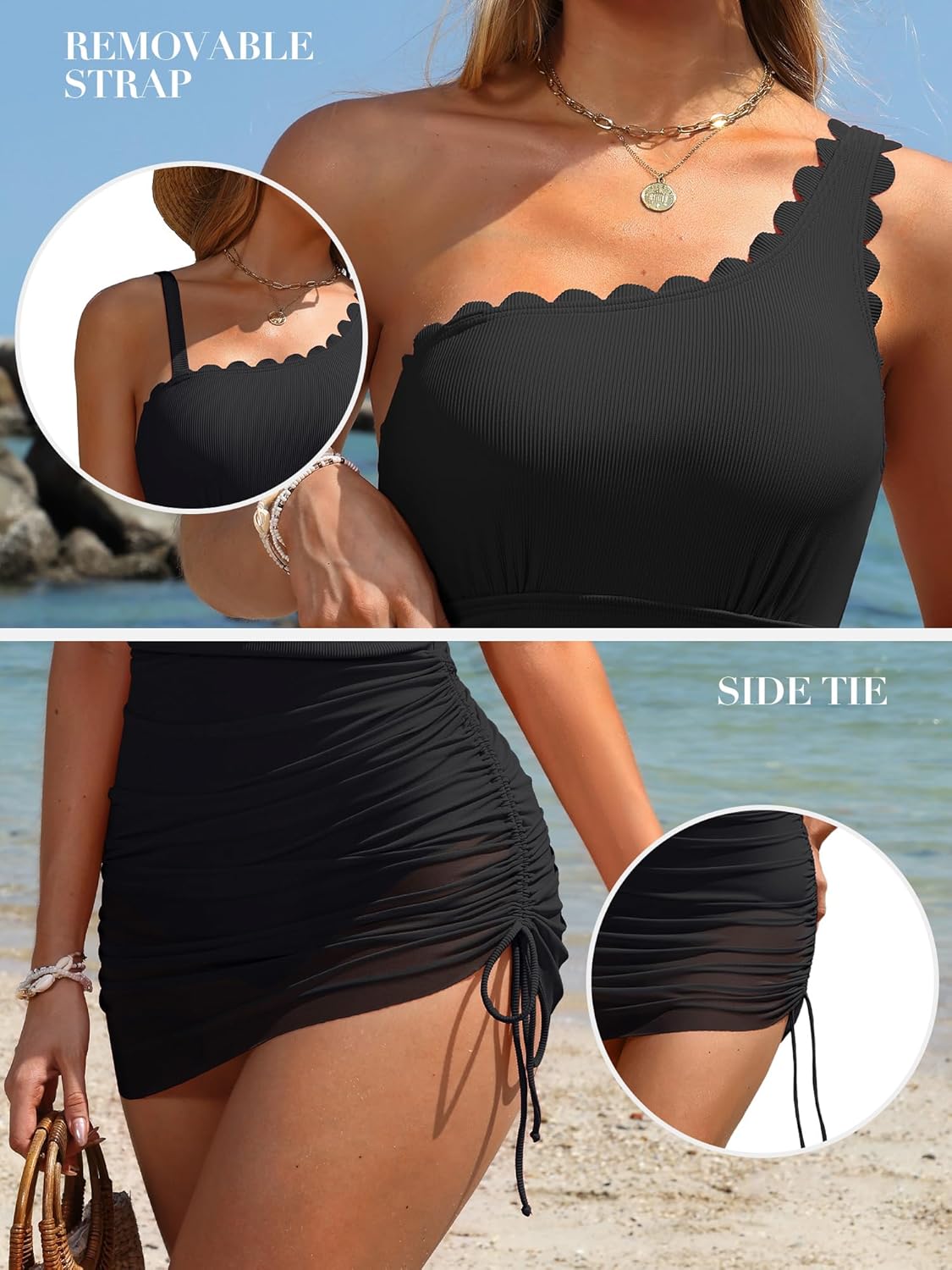 Charmo One Shoulder One Piece Swim Dress Ribbed Scalloped Swimsuit Women Mesh Sheer Wraps Slimming Bathing Suit Swimwear