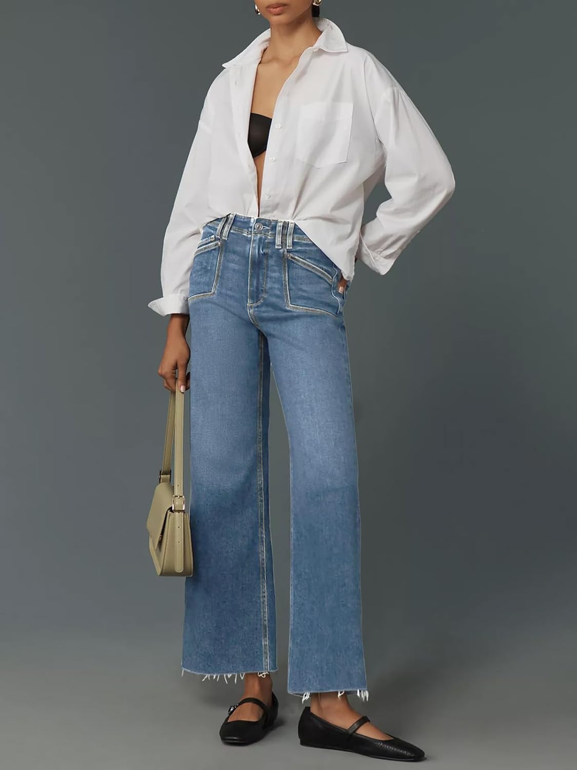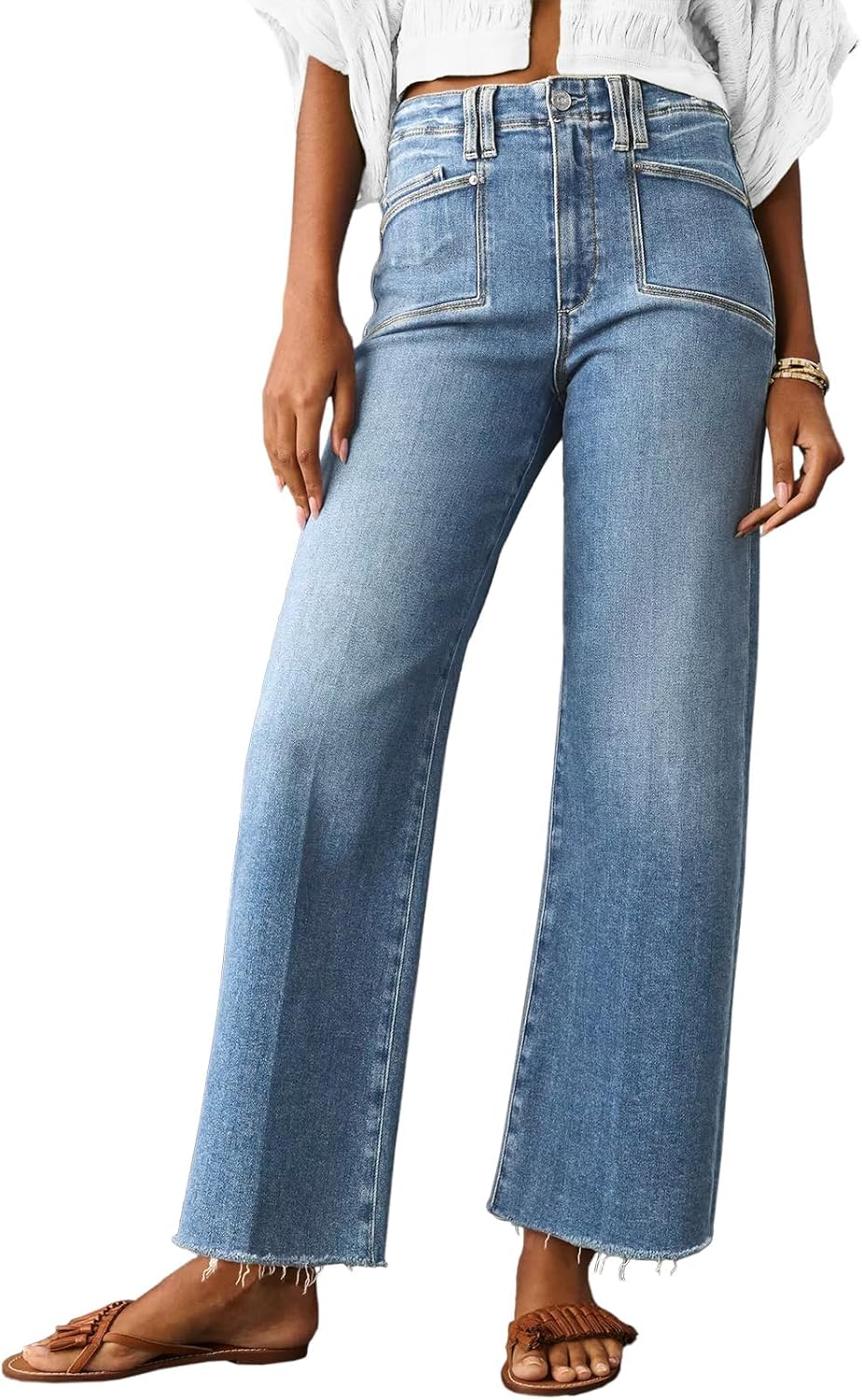 Cicy Bell Womens High Waisted Cropped Jeans Trendy Stretchy Baggy Straight Leg Raw Hem Capri Denim Pants