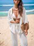 CUPSHE Women’s Crochet Cover Up Set Button Down Hollow Out Top Long Net Pant 2 Piece Beachwear