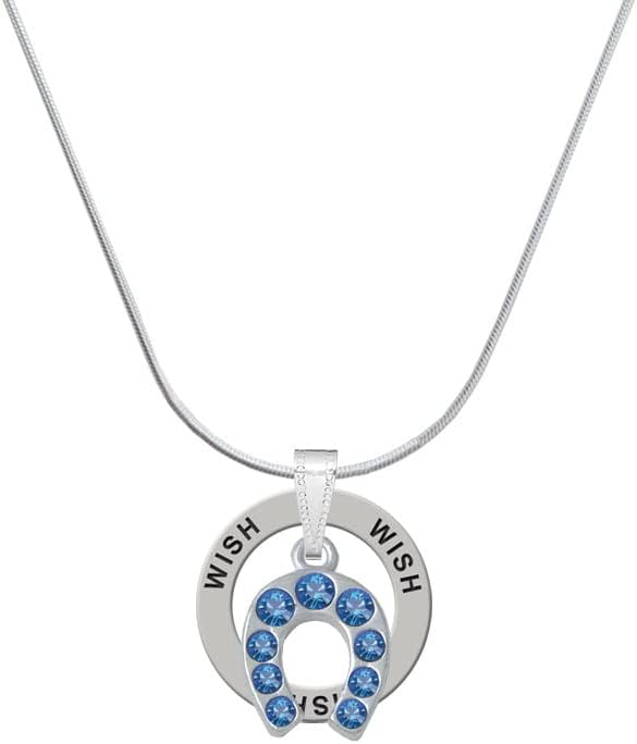 Silvertone Blue Crystal Horseshoe – Wish Ring Charm Necklace, 18″. Charm size is approx. 0.67 x 0.54 x 0.12 inches (HxWxD) including loop. Silvertone snake chain necklace is 18 inches with a lobster claw clasp. Affirmation ring is 7/8″ in diameter. Whether you are blowing out birthday candles, or making a wish on a star, wear this necklace as a reminder. Identify your wish, visualize the outcome, uncover the obstacle, and make your plan. PLEASE NOTE: Our products are not intended for individuals 14 years and younger.