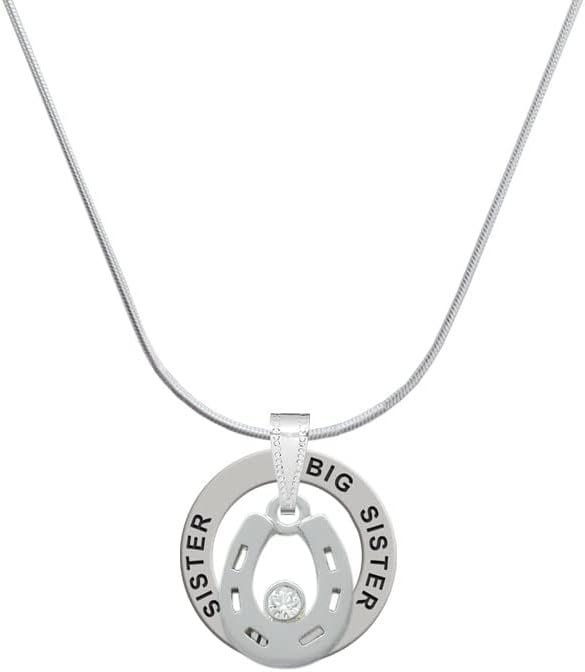 Silvertone Horseshoe with Clear Crystal – Big Sister Ring Charm Necklace, 18″. Charm size is approx. 0.69 x 0.51 x 0.11 inches (HxWxD) including loop. Silvertone snake chain necklace is 18 inches with a lobster claw clasp. Affirmation ring is 7/8″ in diameter. Show your Big Sister that she is the most special person in your life. She is your first best friend, your biggest critic and biggest cheerleader. PLEASE NOTE: Our products are not intended for individuals 14 years and younger.