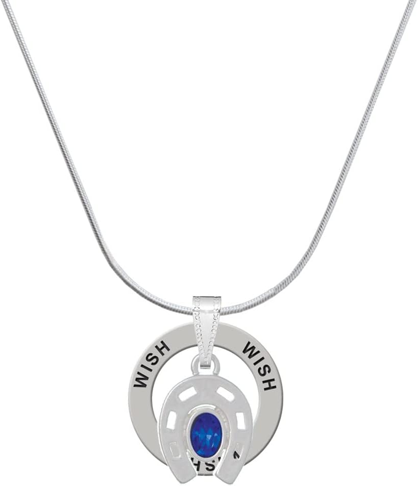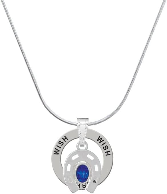 Delight Jewelry Silvertone Horseshoe with Oval Blue Crystal – Wish Ring Charm Necklace, 18″