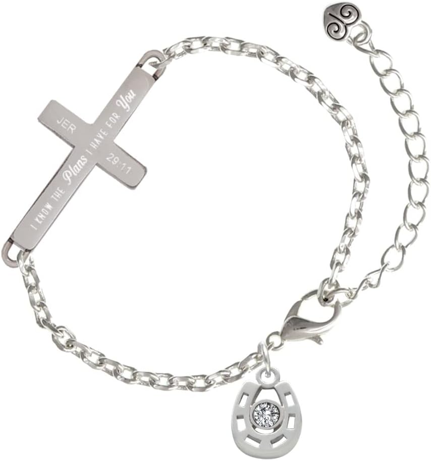 Delight Jewelry Silvertone Small Clear Crystal Horseshoe I Have Plans for You Engraved Cross Charm Bracelet, 6.5+1.5″ Extender