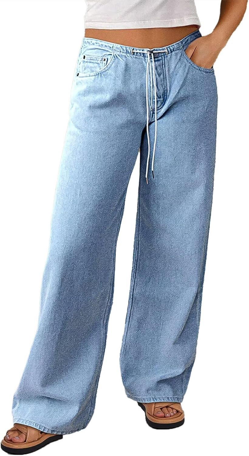Flamingals Straight Leg Jeans for Women Mid Waist Casual Baggy Drawstring Eyelet Waist Adjustable Denim Jeans
