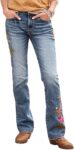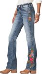 Flamingals Women’s Floral Embroidery Mid Waist High Stretch Bootcut Jeans with Pockets