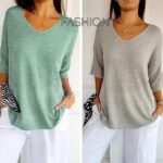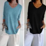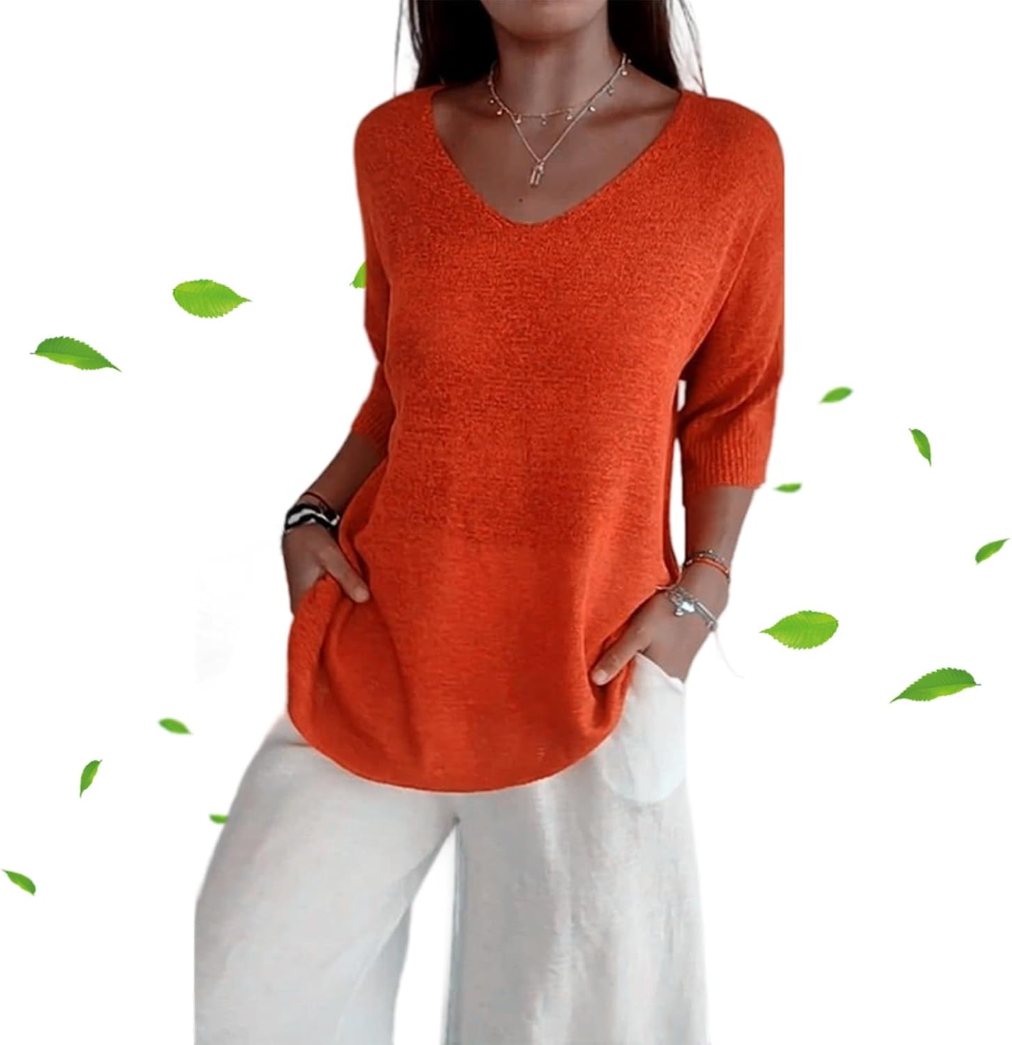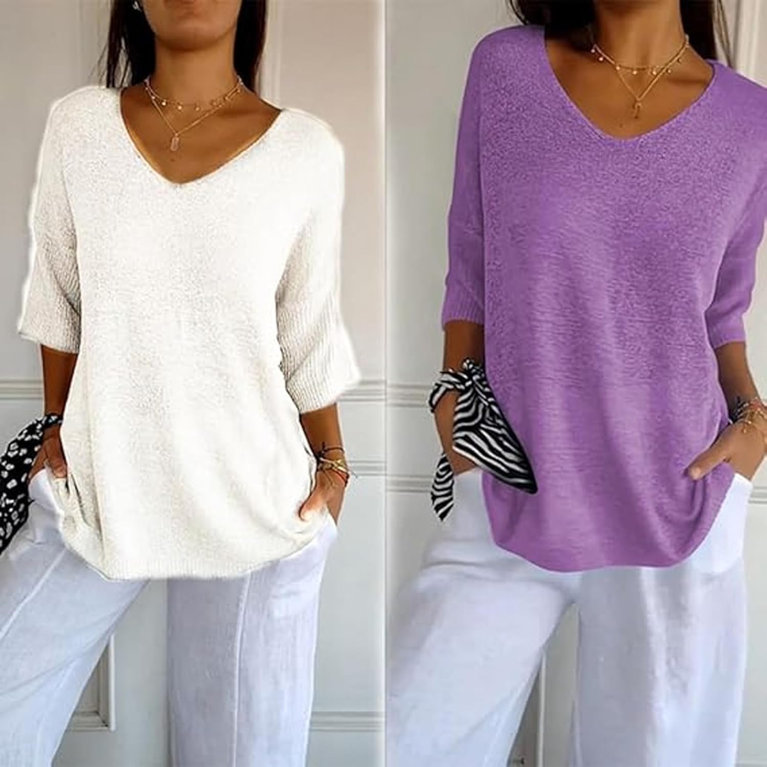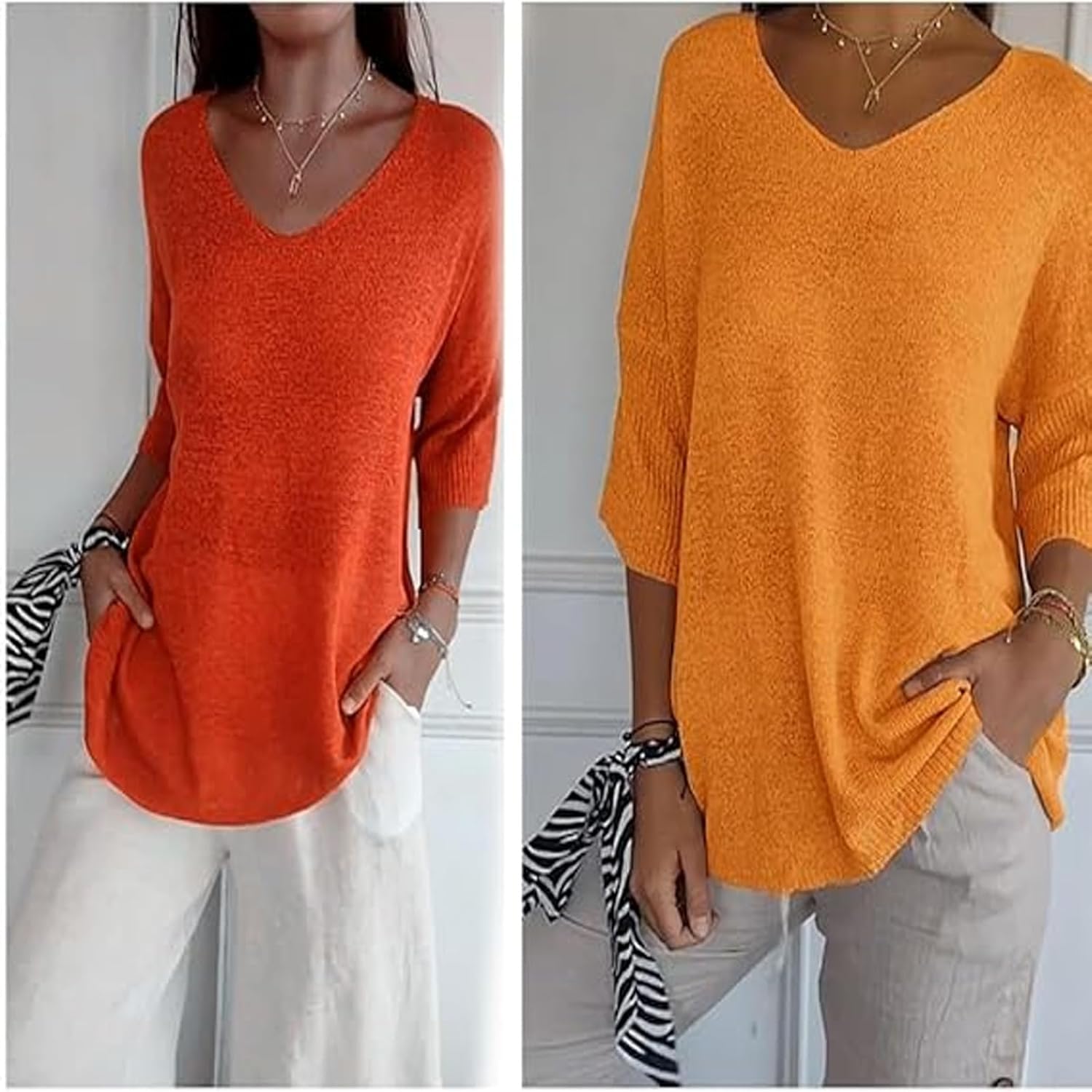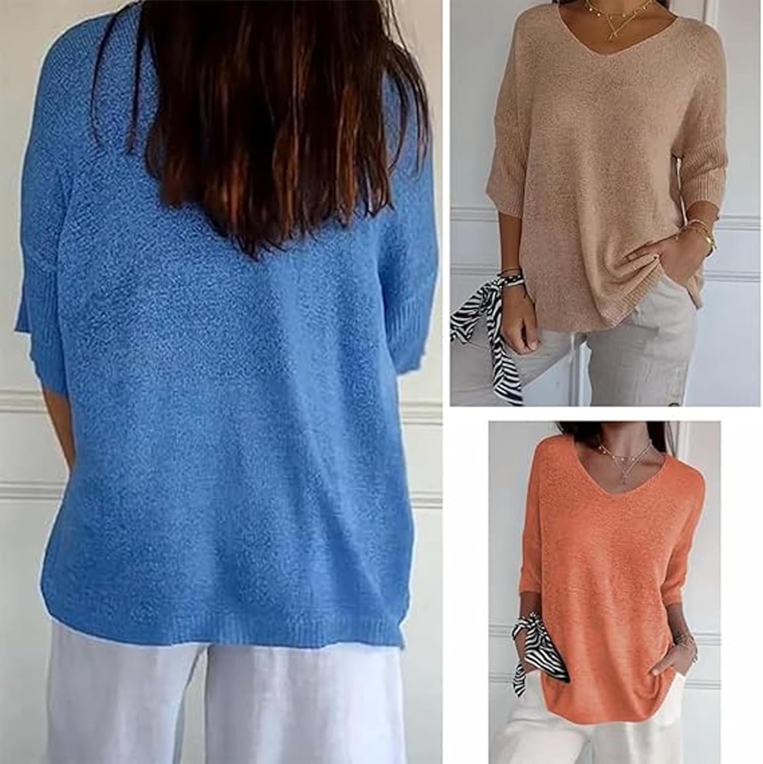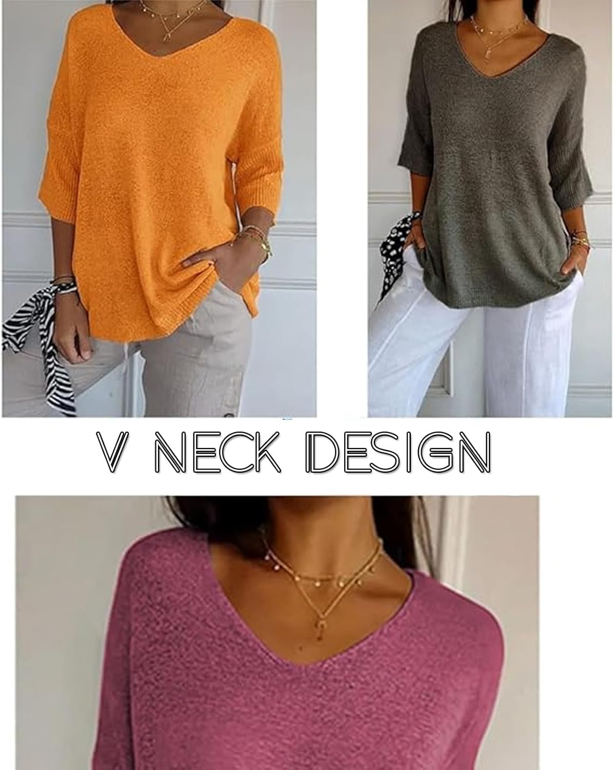 Flowarmth Solid Color Knitted V-Neck Top,Women’s Solid Color Knitted V-Neck Top, Lightweight 3/4 Sleeve Sweater