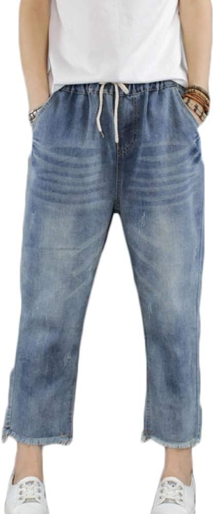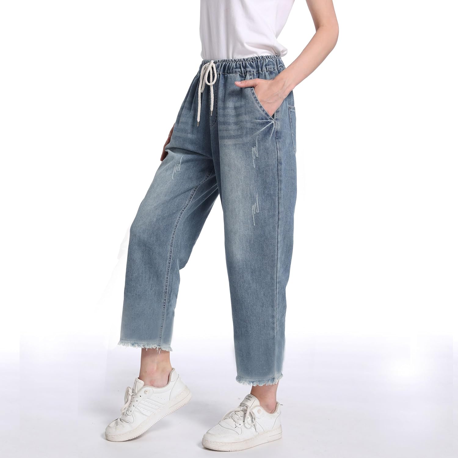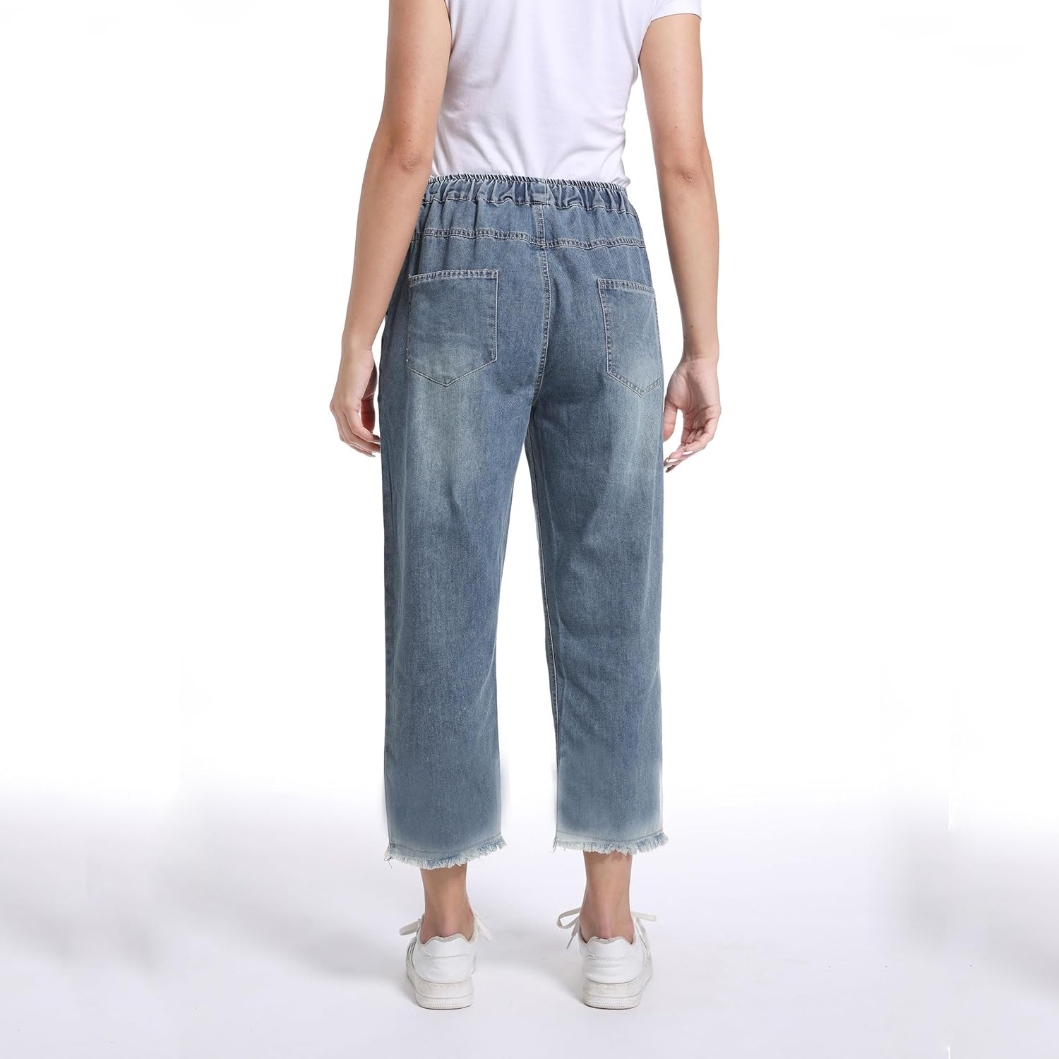 FTCayanz Women's Elastic Waist Cropped Jeans Baggy Drawstring Stretch Denim Pants with Pockets
