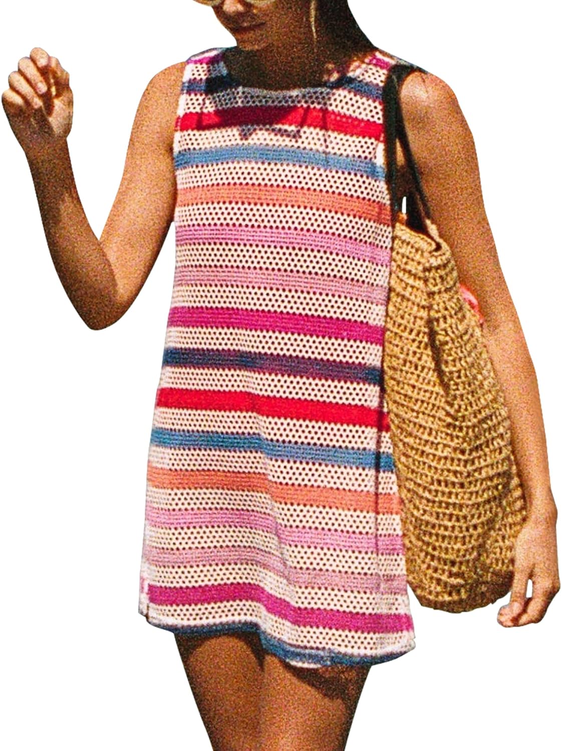 Gacaky Women’s Summer Mini Dress Swimsuit Crochet Swim Cover Up Bathing Suit Swimwear Mesh Knit Beach Mini Dress