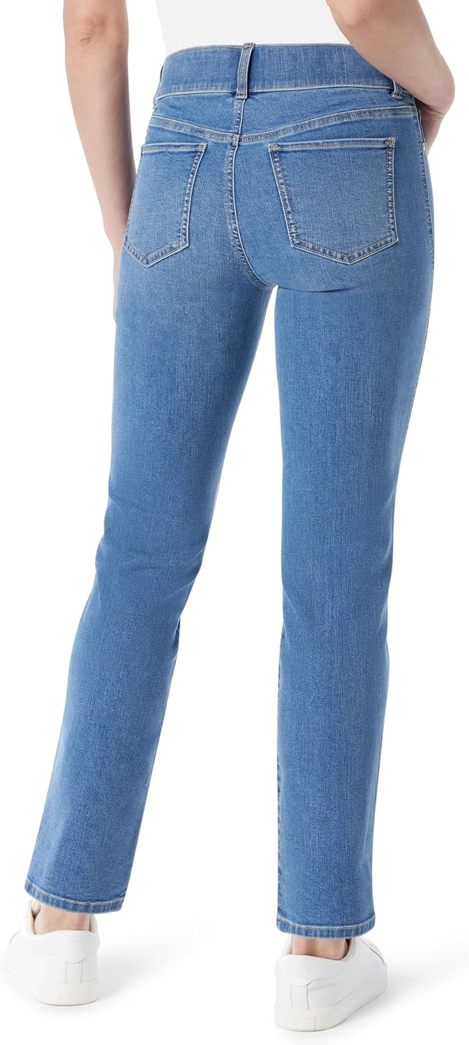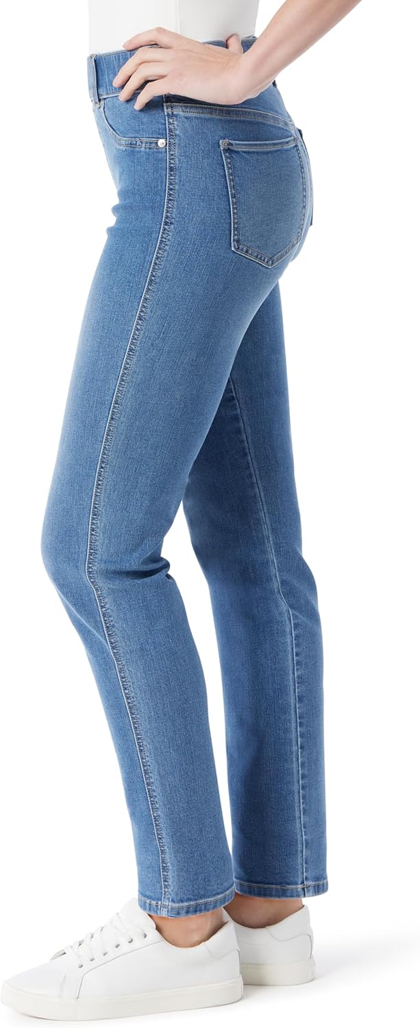 Gloria Vanderbilt Women’s Apparel; Shape effect comfort waist pull on striaght leg jean gives you that cover confidence we all want whether your top is tucked in or not. The high rise waist sits at natural waistline with a comfortable elastic waistband and fully functional back pockets so you can run around with or without a handbag. This striaght leg jean will go great with all your tops from fashion forward to a basic tee shirt as well as all footwear from strappy sandals and trendy heels to your favorite flats or boots. the perfect year round bottom available in assorted washes, see color name for specifics. – Goria Vanderbilt, Effortlessly fun and stylish. A versatile yet classic look that attracts and connects with the modern sensibility of consumers of all ages.