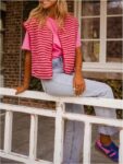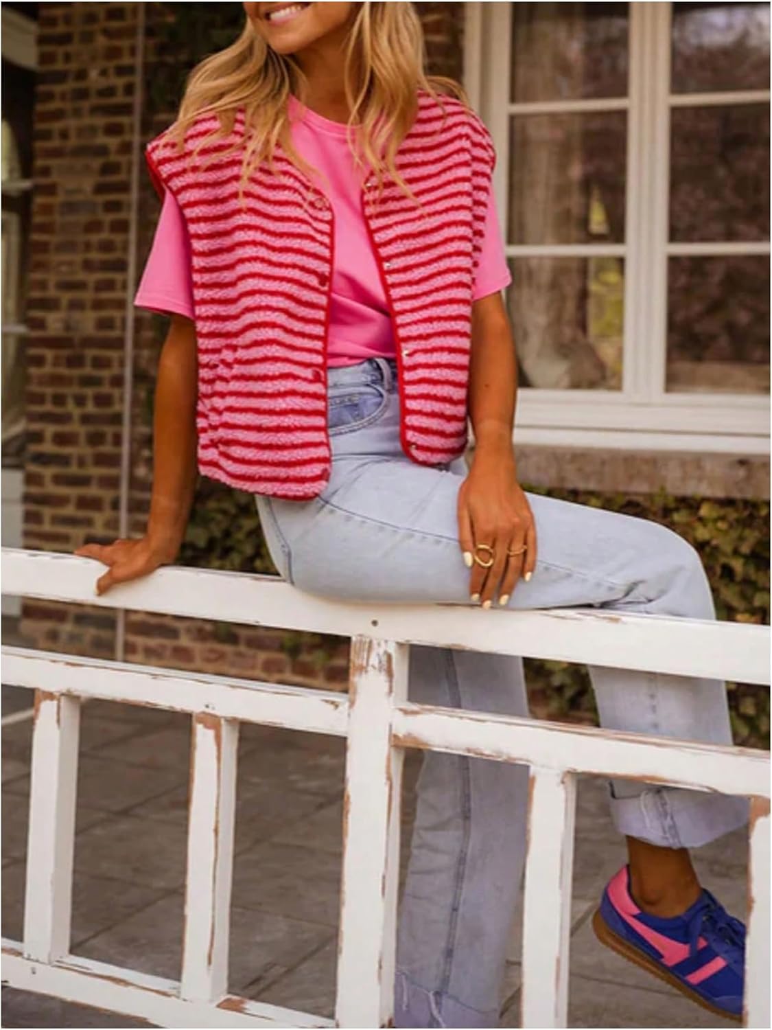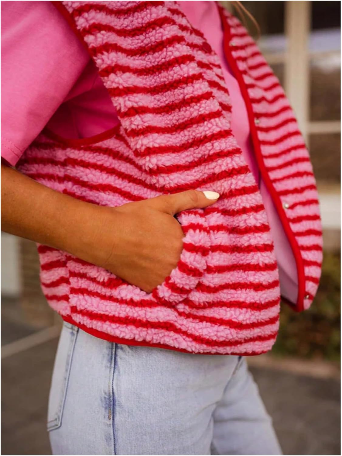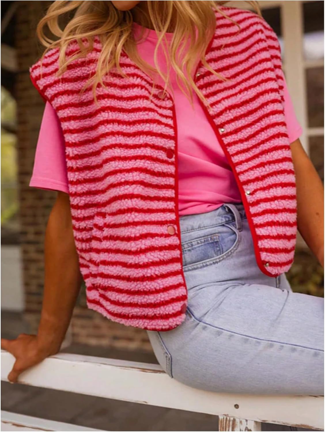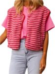 GORGLITTER Women’s Striped Sherpa Vest Button Up Sleeveless Fleece Jacket with Pockets