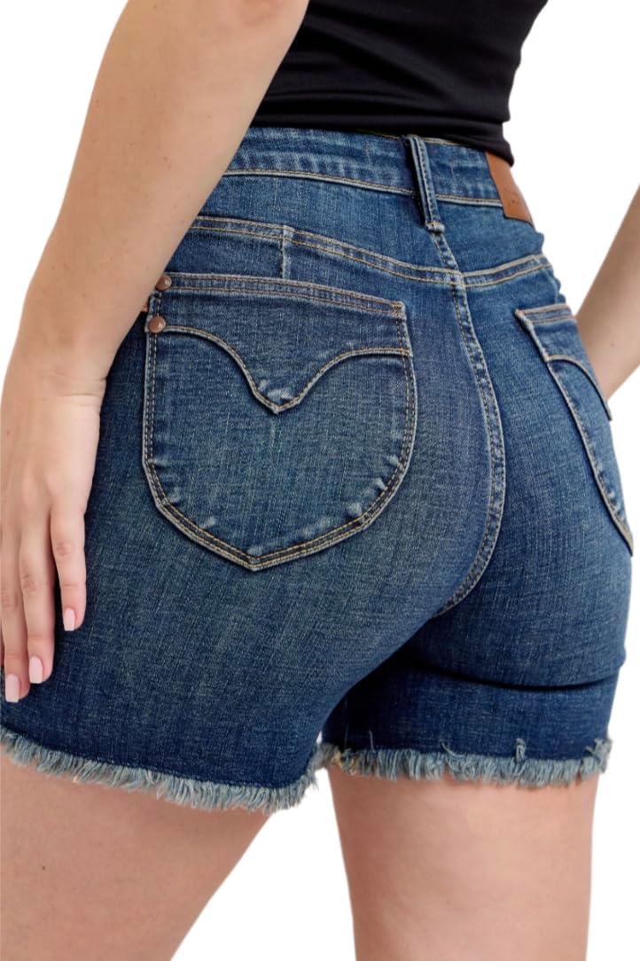 These tummy control shorts feature a fray hem detail and shield back pockets for a fashionable and flattering look. The tummy control design provides a slimming effect and enhances the silhouette. The fray hem adds a trendy and edgy touch to the shorts’ design. The shield back pockets offer a unique and decorative element to the shorts. Perfect for a stylish and comfortable outfit, these jeans shorts combine fashion and functionality effortlessly. Enhance your summer wardrobe with these tummy control fray hem shorts with shield back pockets for a chic and flattering ensemble.