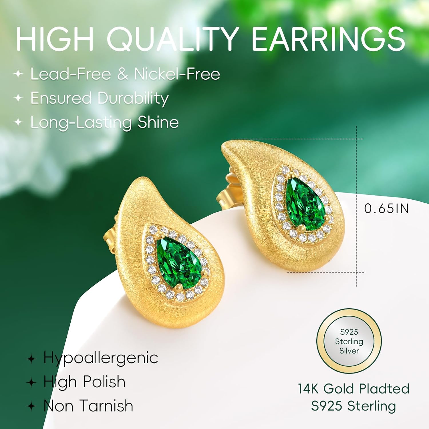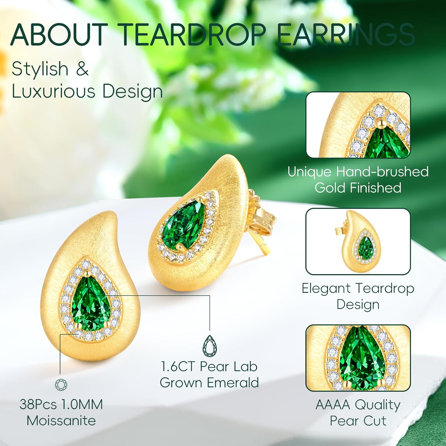 LEONIDS 14K Gold Teardrop Earrings for Women | Moissanite or Lab-Grown Emerald Stud Earrings with Hairline Detailing Non Tarnish | Birthday Jewelry Gifts for Her