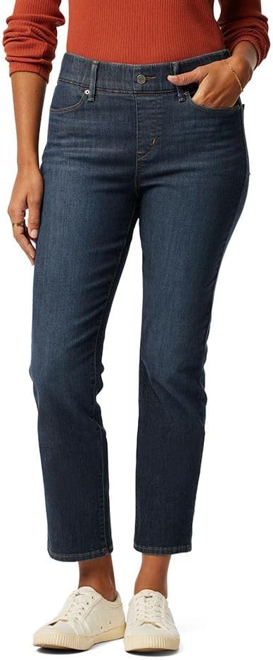 An updated version of our #1 best-selling straight jeans, the Women’s Totally Shaping Ultimate Pull-On Ankle Straight Jeans from Levi Strauss Signature™ have a pull-on waistband, but the faux button and functional belt loops give them the look and feel of classic 5-pocket styling. Made from premium super-stretch denim that smooths and contours, they have a built-in tummy-smoothing panel that holds you in. The fit is slim through the hip and thigh with a straight leg throughout