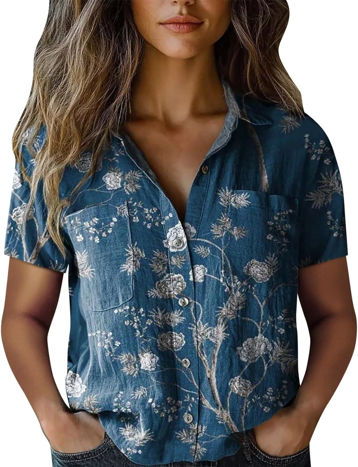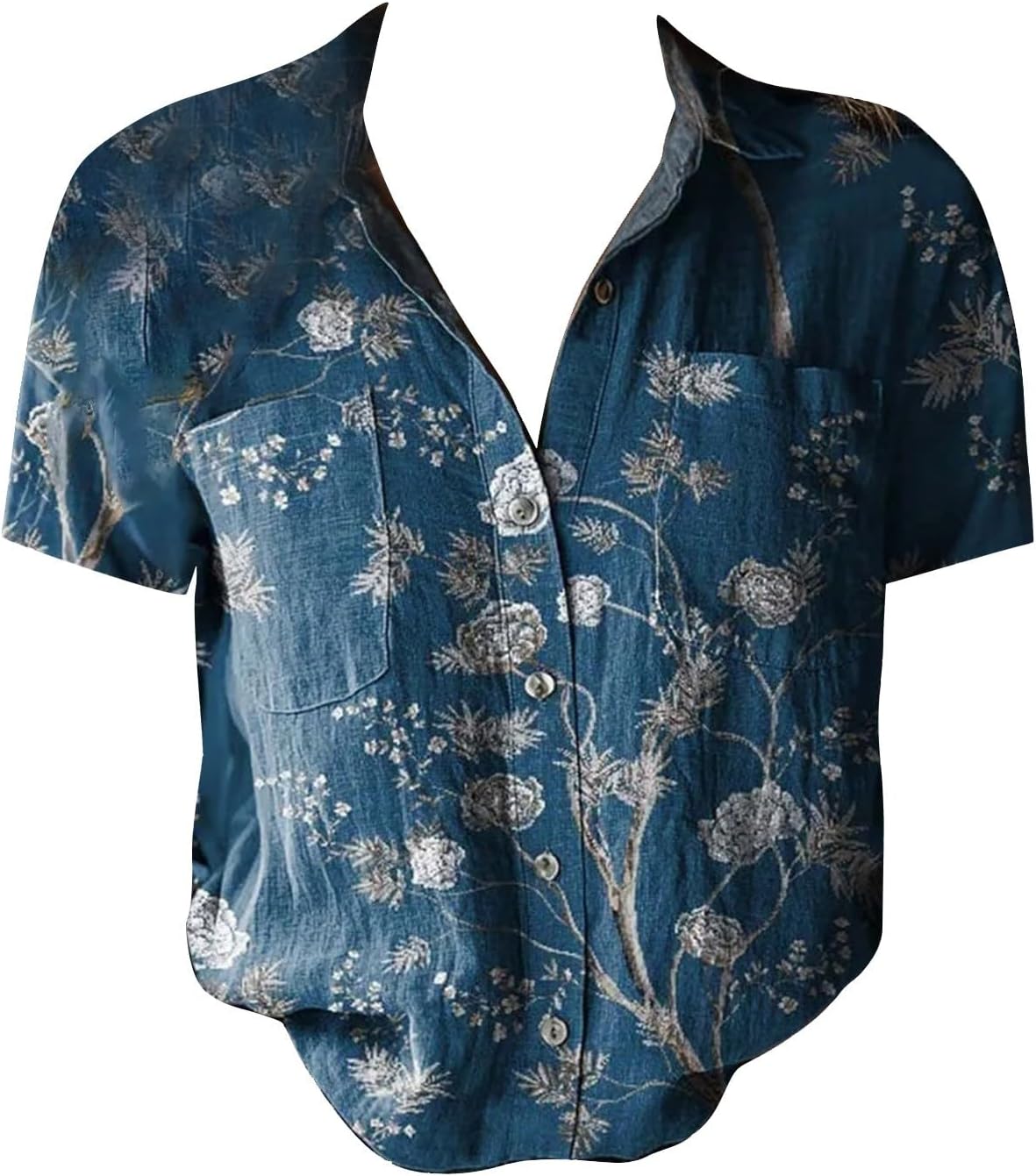 Linen Shirts for Women Women Cotton Shirt Printed V Neck Button Down Casual Tops Short Sleeve Blouse Work for Long