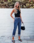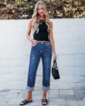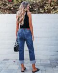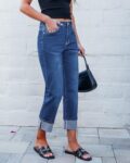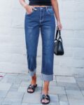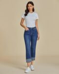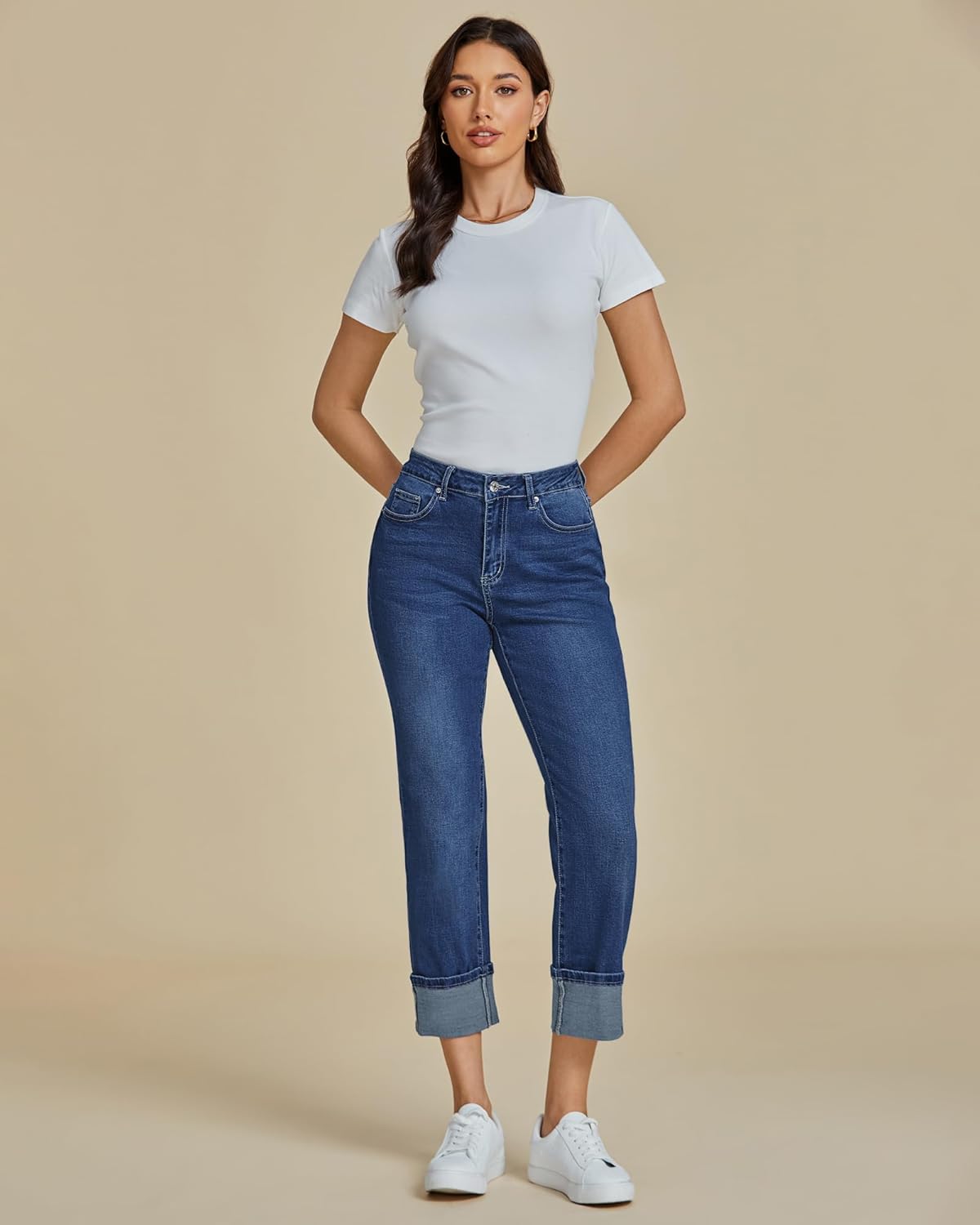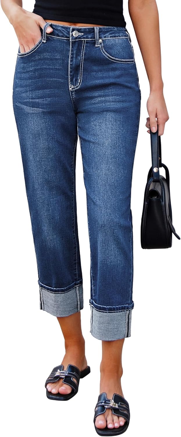 luvamia Straight Leg Jeans for Women Trendy Cropped High Waisted Cuffed Hem Stretchy Boyfriend Capri Jeans with Pockets