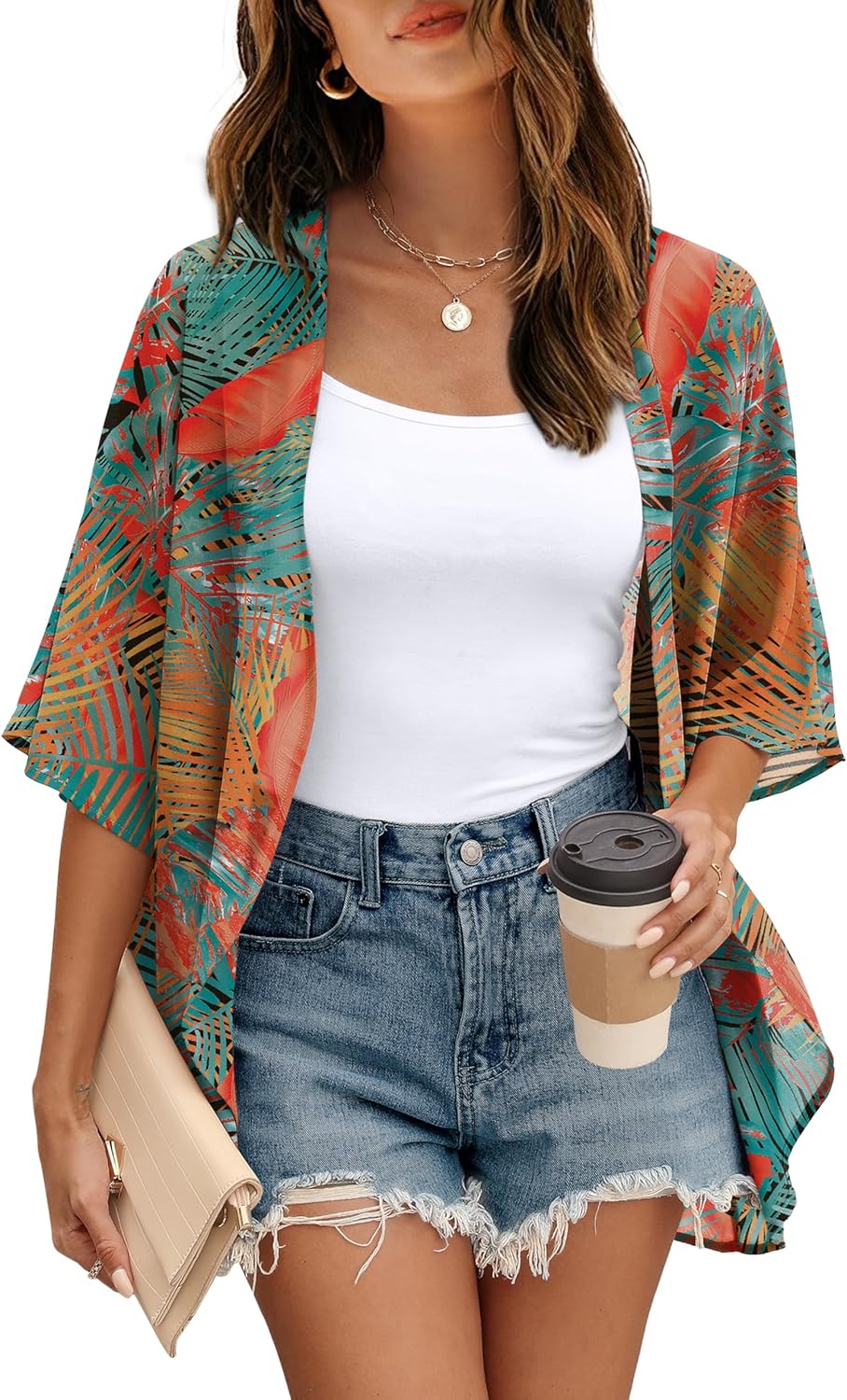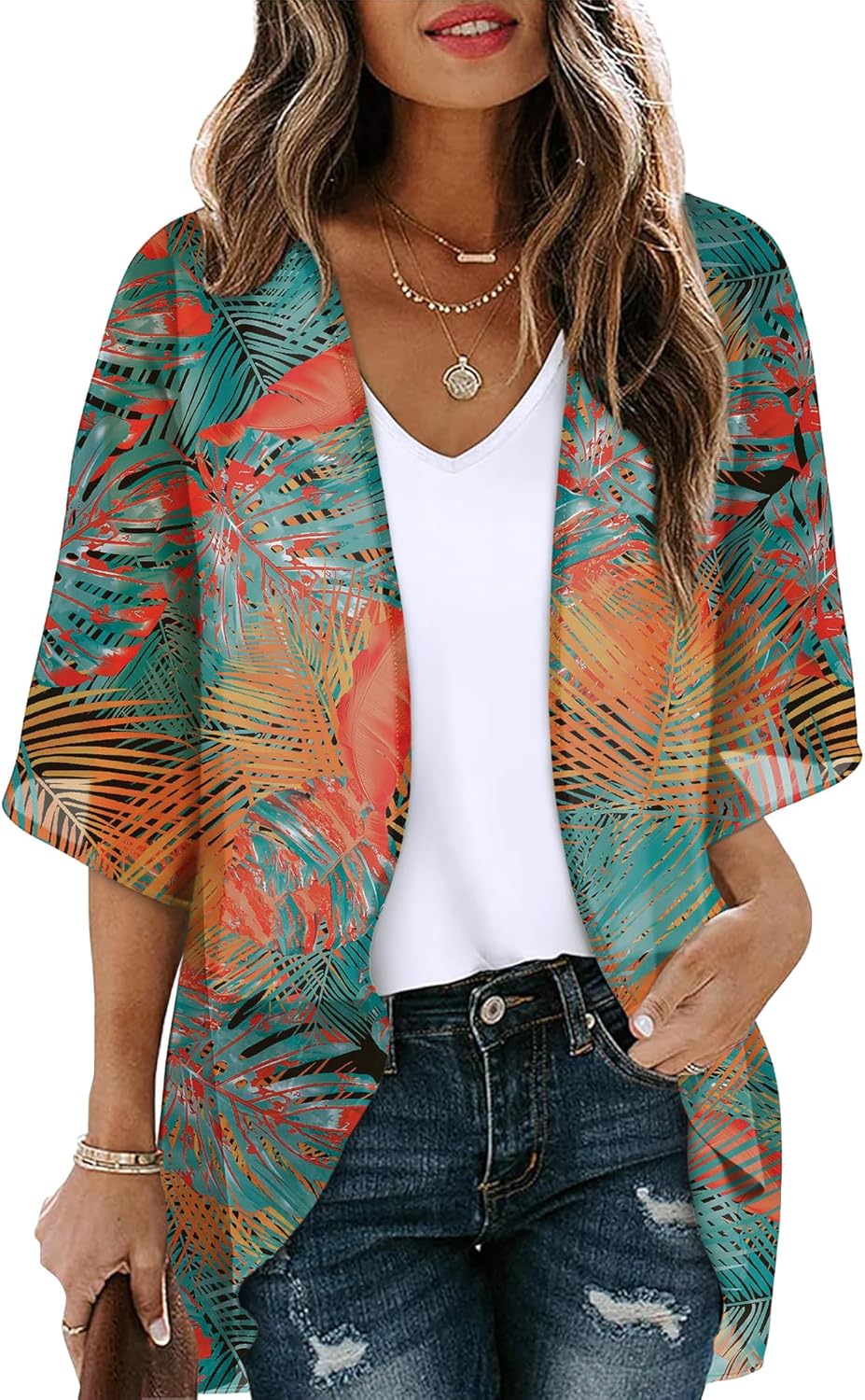 OFEEFAN Beach Cover Ups for Women 3/4 Length Sleeve Womens Tops Summer Cardigan Casual Blouses Loose Fit
