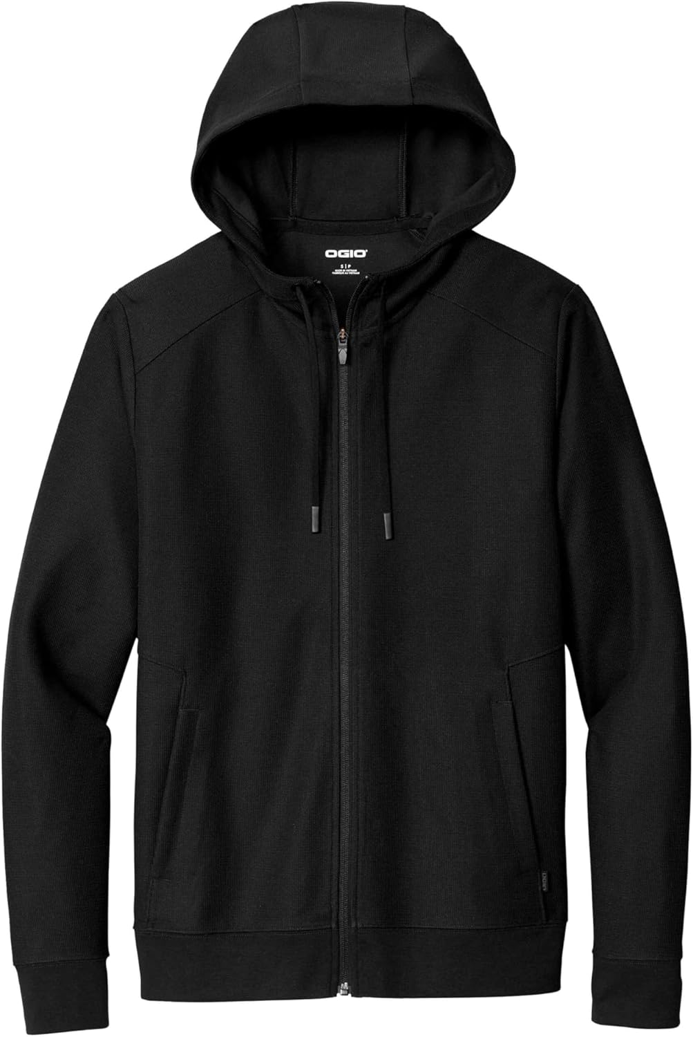 Revive your corporate or casual wardrobe with this comfortable versatile double-knit layering essential that has modern angled lines and OGIO edge. 9-ounce 67/30/3 poly/rayon/spandex double knit (Blacktop) 9-ounce 65/32/3 poly/rayon/spandex double knit (Light Heather Grey) OGIO heat transfer label for tag-free comfort 3-panel hood Matte black eyelets with stretch drawcords and matte black dipped tips Reverse coil zipper Open pockets Rib knit cuffs Black woven OGIO label on left hip Rib knit hem