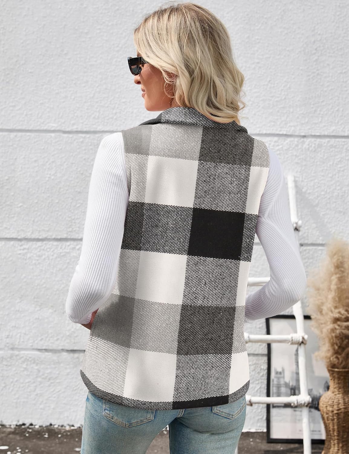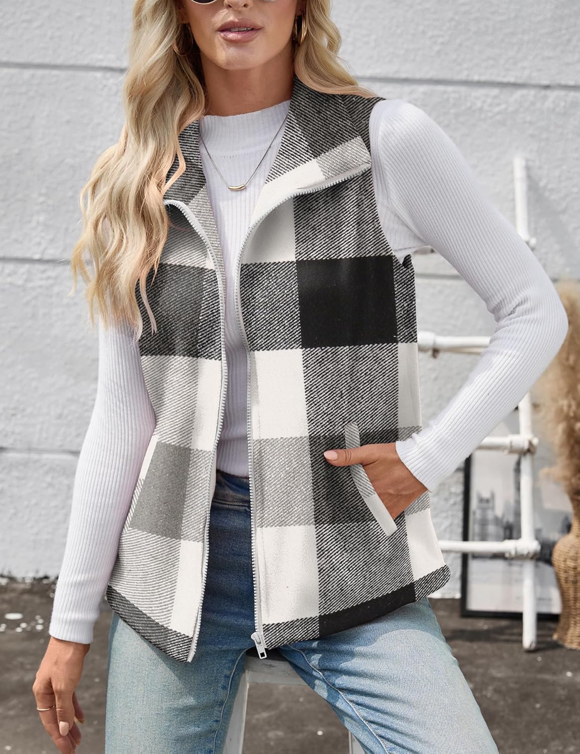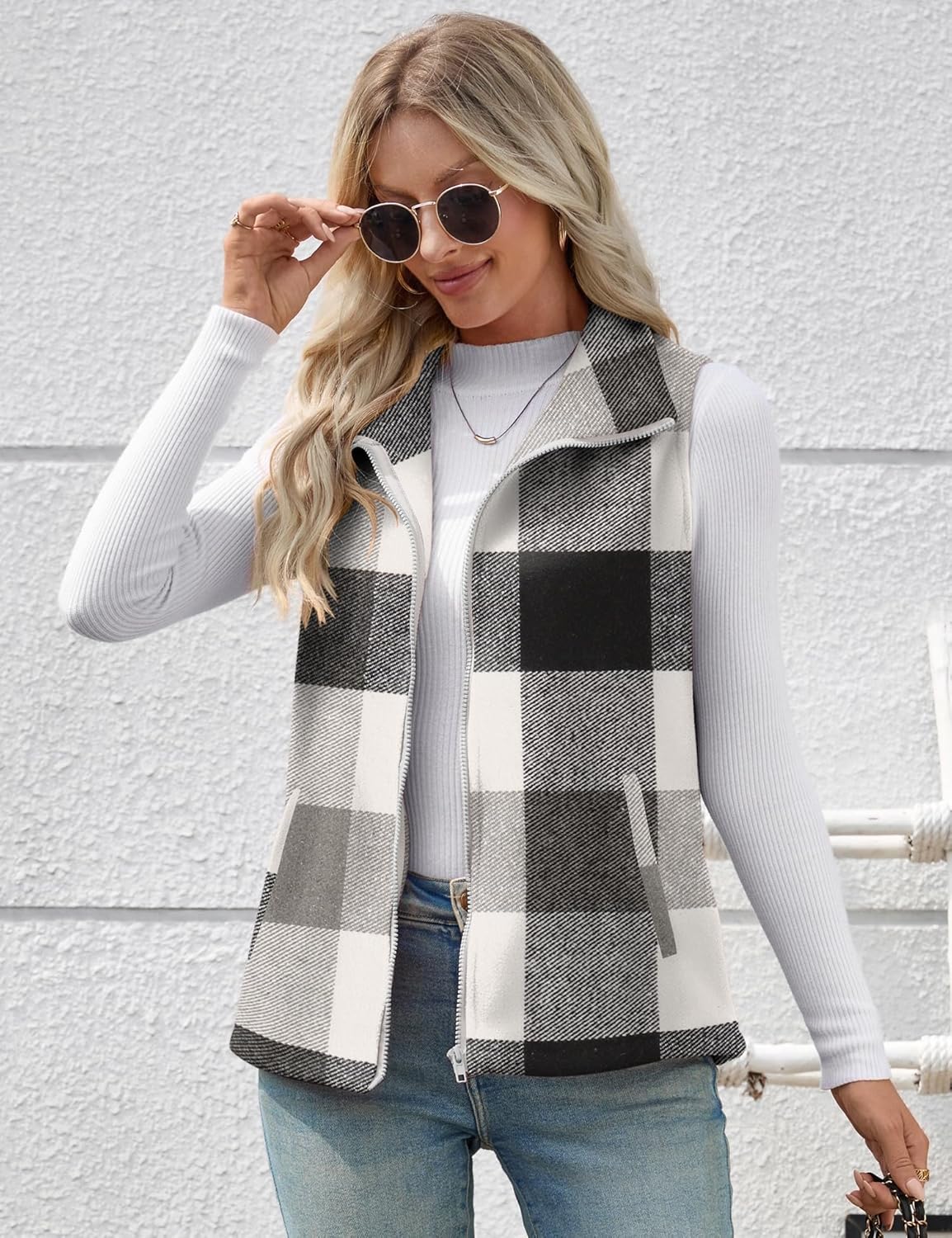 Rapbin Women’s Plaid Outerwear Vests Tops Zip Up Collared Sleeveless Jacket with Pockects