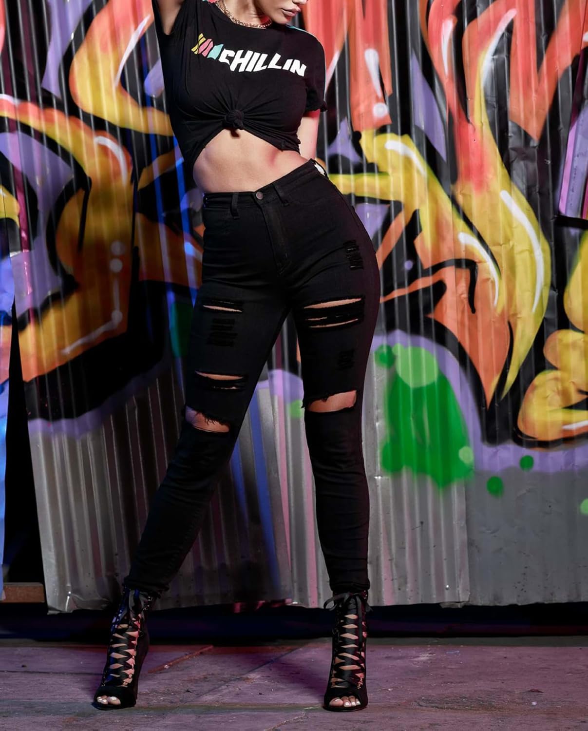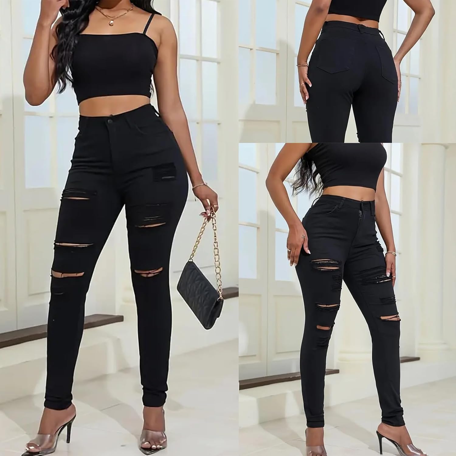Black destroyed jeans design high rise,denim destroyed,skinny leg,zipper closure,classic five-pockets slim fit,perfect shape curve!