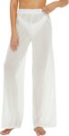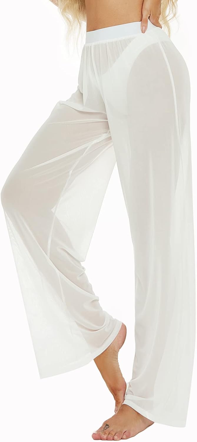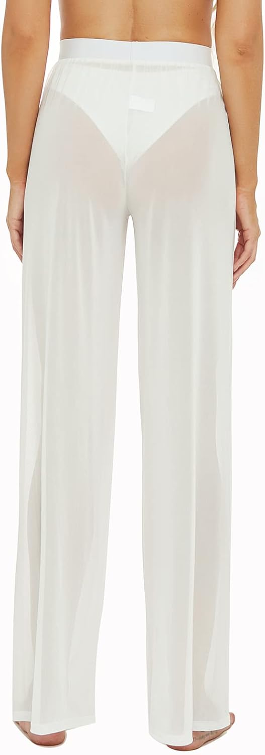 RUEWEY Women See Throug Mesh Flare Cover up Pants Swimsuit Bikini Bottom Cover up Elastic Waist Wide Leg Palazzo Trousers