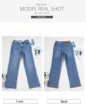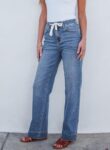 Customers find these jeans comfortable and well-fitting, particularly noting their perfect length for 5’4″ individuals. The pants receive positive feedback for their lovely thick material, stretchiness, and lighter weight denim. Customers appreciate the style, with one mentioning the tie detail at the waist, and they like the drawstring feature. However, opinions about length are mixed, with some finding them too long while others say they’re too short.