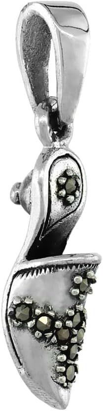 This Very Cute Ladies Shoe Pendant is Solid 925 sterling silver Set with Marcasite stones 7/8 inch (22mm) long and 1/4 inch (6mm) wide and antique finished to highlight details and sold with or without a silver chain.