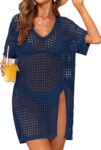 SOCIALA Swimsuit Coverup for Women Side Split Crochet Bathing Suit Cover Up Mesh Short Sleeve Beach Swimwear Dress