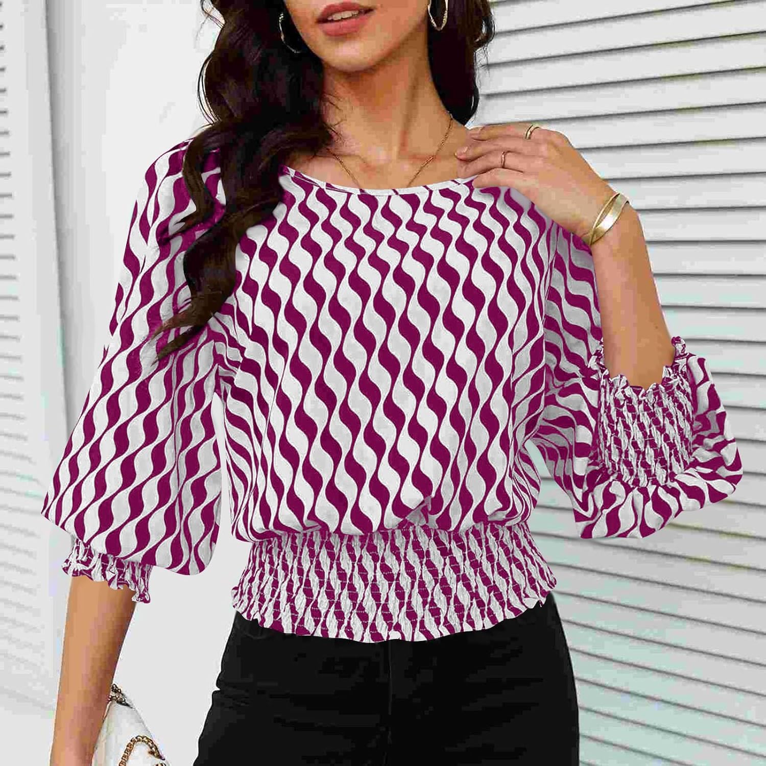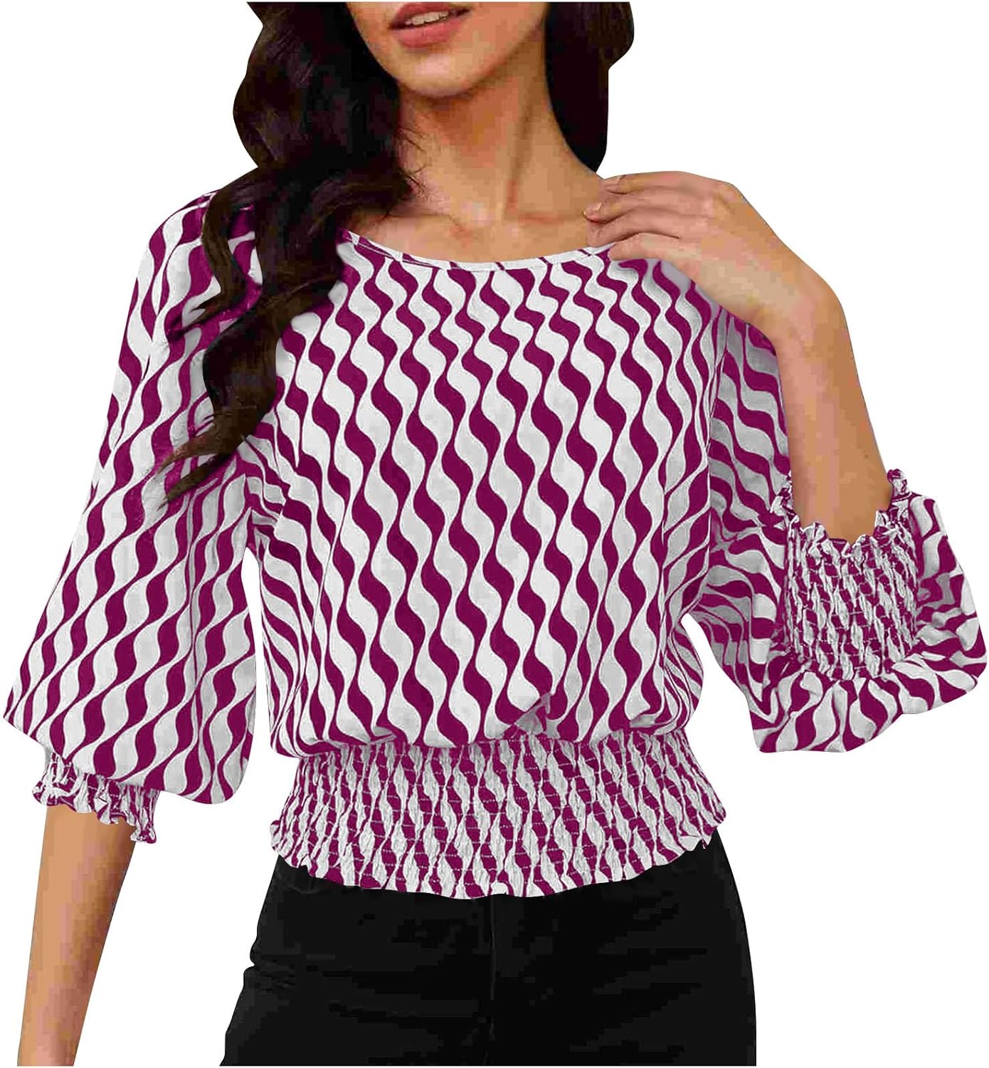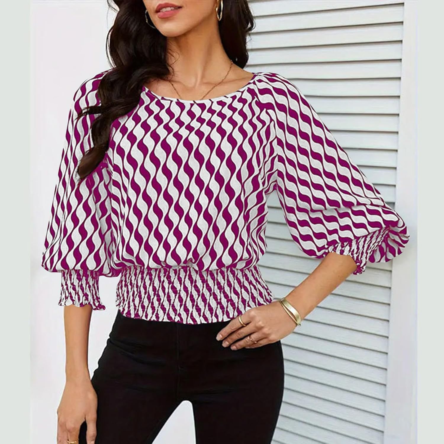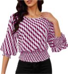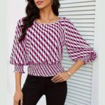 Trendy Lantern Sleeves Tops for Women with Cinched Waist Contrasting Color Print Blouse Dressy Elegant T Shirts